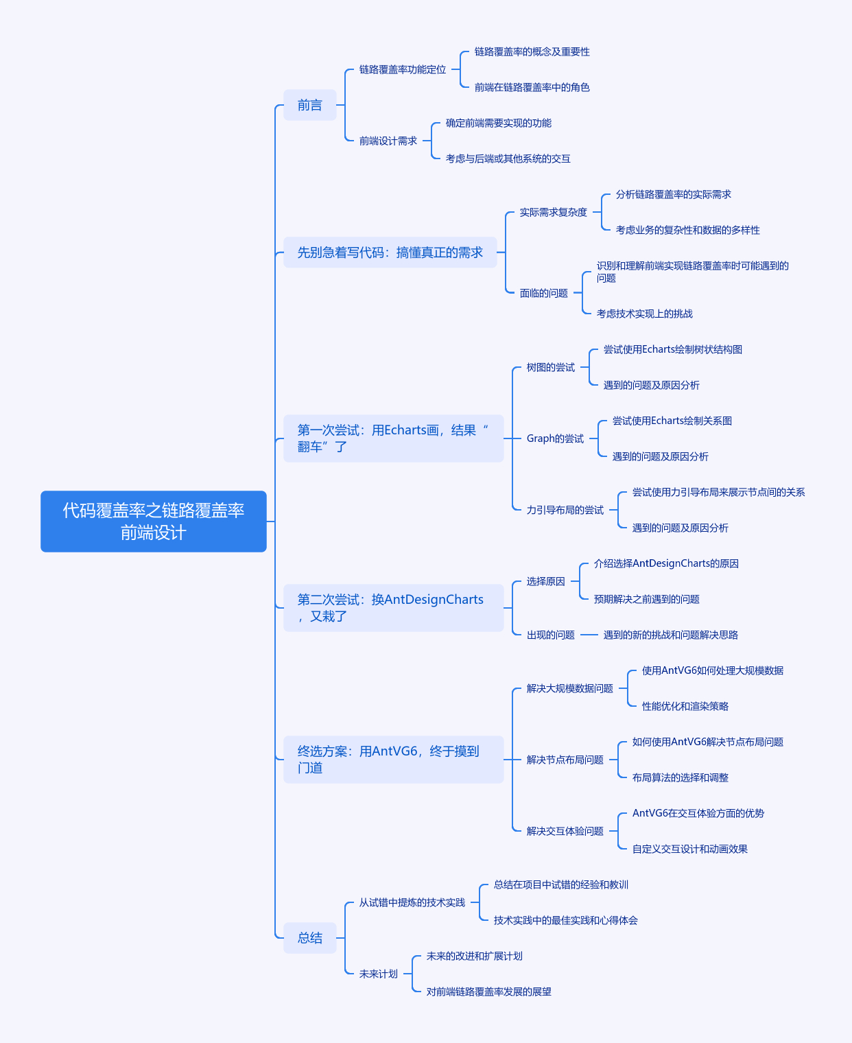 文章围绕代码覆盖率之链路覆盖率前端设计展开。先介绍链路覆盖率功能定位及前端设计需求,后详述三次技术选型尝试。先用 Echarts,树图不适用多对多关系,力引导布局不适用于大数据量;再试 Ant Design Charts,存在卡顿和功能融入问题。最终选用 AntV G6,解决大规模数据、布局和交互问题。最后总结技术实践经验,提出将链路覆盖率与代码变更结合的未来计划。