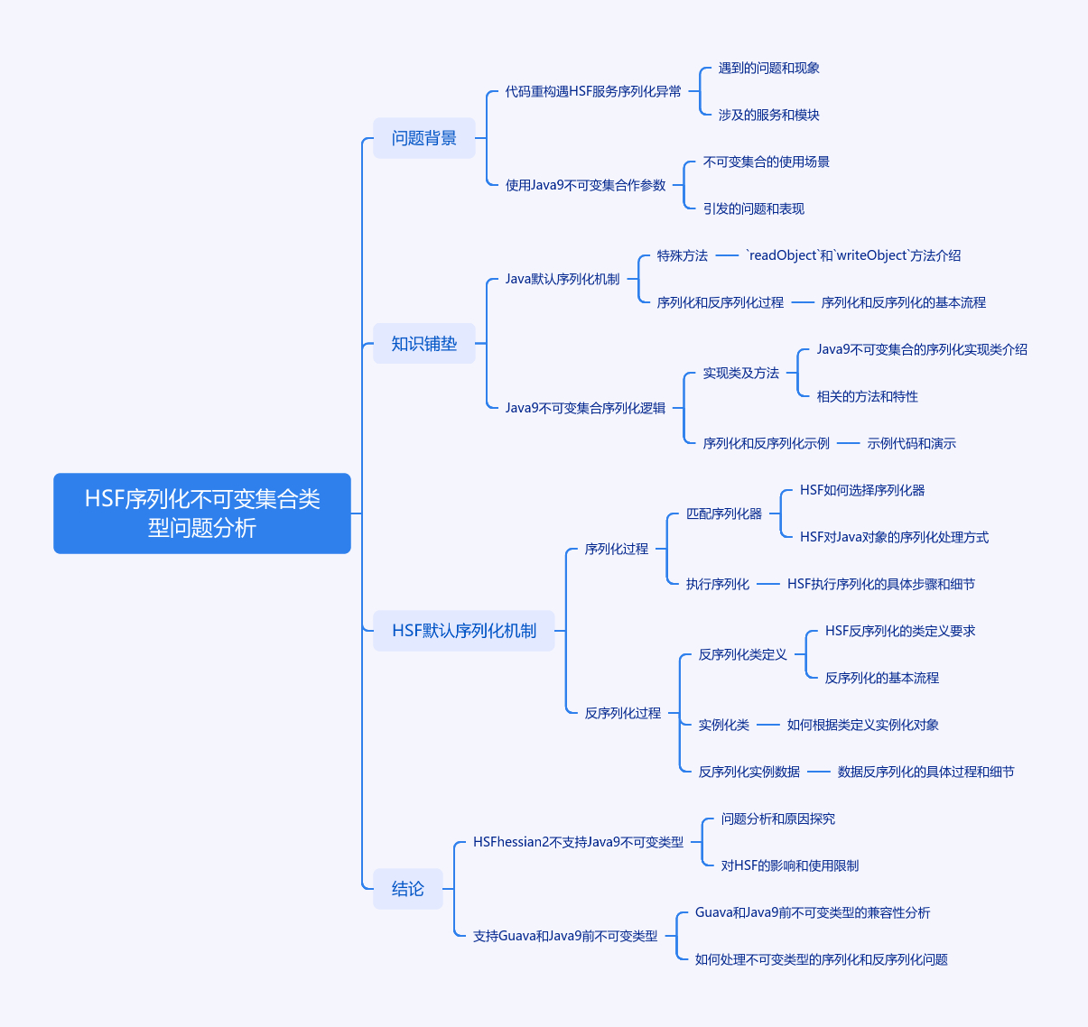 文章分析了 HSF 服务使用 Java 9 不可变集合作参数致服务端反序列化失败问题。先介绍 Java 默认序列化机制,含特殊方法及过程,再说明 Java 9 不可变集合序列化逻辑。接着阐述 HSF 默认用 hessian2 序列化,其支持 writeReplace 但不支持 writeObject,仅序列化非 transient 字段,未序列化集合元素 array,反序列化时 readResolve 抛异常。结论是 HSF hessian2 不支持 Java 9 不可变类型,而对 Guava 和 Java 9 前不可变类型支持。