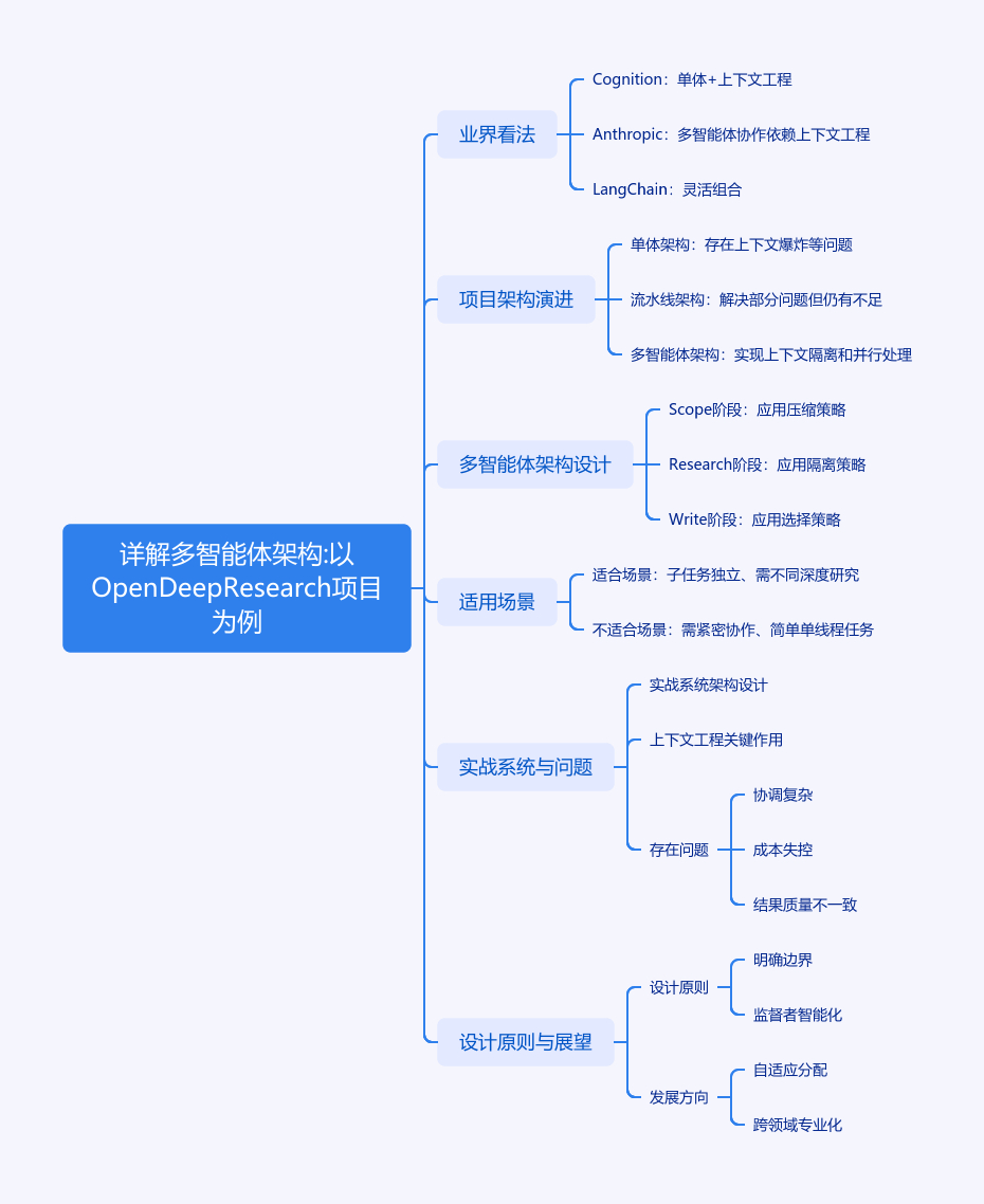 文章以Open Deep Research项目为例详解多智能体架构。先介绍业界对多智能体与上下文工程的不同看法,接着阐述项目从单体架构、流水线架构演进到多智能体架构的历程。深入解析多智能体架构三阶段设计,体现上下文工程思想。指出适合和不适合多智能体的场景,介绍实战系统、效果、踩坑经验和设计原则。最后展望多智能体发展方向,强调架构变迁是为解决问题。