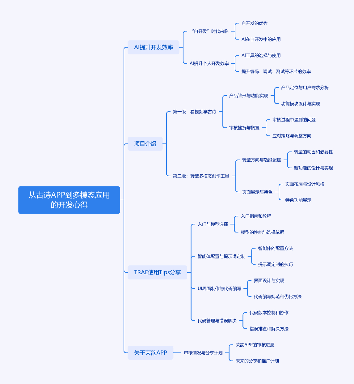 本文作者分享从古诗 APP 到多模态应用的开发心得。起初为孩子学古诗开发 APP,用 TRAE 实现诗词阅读、列表、助手等功能,但因苹果审核需资质搁置。后转型多模态创作工具,先聚焦文生图。还分享 TRAE 使用技巧,如当编程老师、选 Claude - 4 - Sonnet、配置不同智能体、定制提示词等,最后提到 APP 正苹果审核,通过后分享。