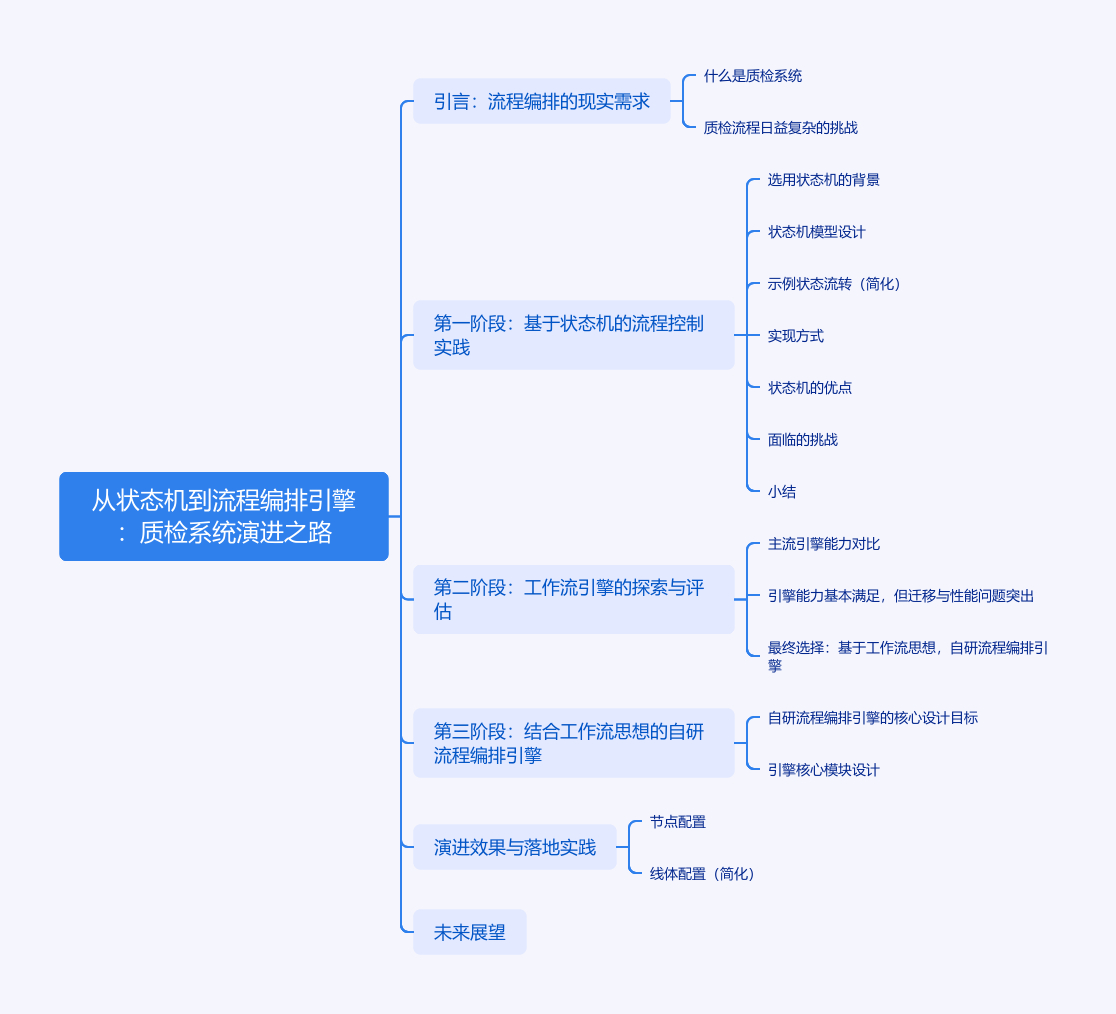 文章讲述质检系统从状态机到流程编排引擎的演进。初期用状态机,流程清晰、执行稳定,但业务复杂后,其分支和并行处理能力弱、配置依赖开发等问题凸显。调研开源工作流引擎,虽功能满足但迁移和性能问题大。于是自研流程编排引擎,目标是轻量集成、支持并行分支、可视化配置等,核心模块有流程建模、调度和节点执行,落地后提升配置灵活性,未来将迁移旧流程、升级架构。