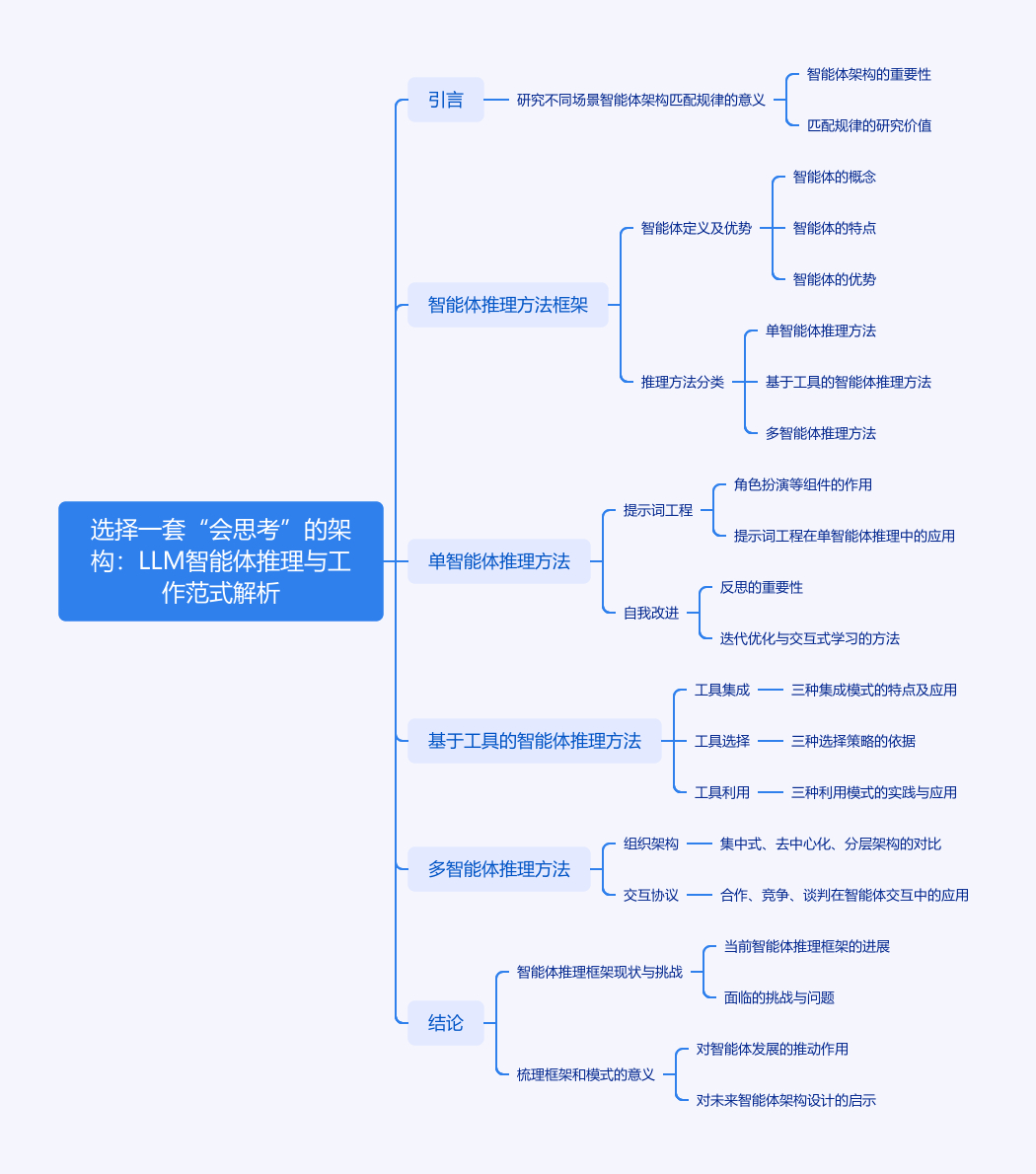 文章围绕LLM智能体推理与工作范式展开。先指出构建智能体内部推理架构、规范工作范式对行业智能化改造很关键。接着将智能体推理方法分为单智能体、基于工具、多智能体三类并详述。单智能体有提示词工程和自我改进;基于工具含集成、选择、利用步骤;多智能体涉及组织架构和交互协议。最后表明梳理框架和模式可促进技术标准化,指导AI应用推广。