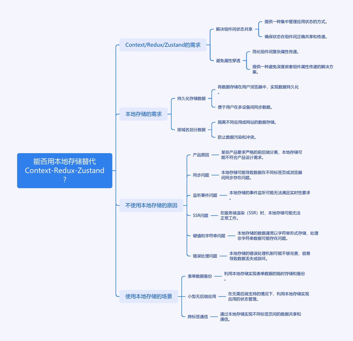 文章探讨能否用本地存储替代 Context、Redux、Zustand。先介绍 Context 等用于解决 React 组件间状态共享问题,避免状态提升导致的属性穿透。本地存储可持久化数据,数据在浏览器存在期间都保留。但用其替代有诸多问题,如产品上部分状态无需持久化,同步到 React 困难,监听变化有局限,不支持 SSR,命名易冲突,还需处理多种错误。本地存储适合表单数据备份、小型无后端应用等,不适合共享状态管理。