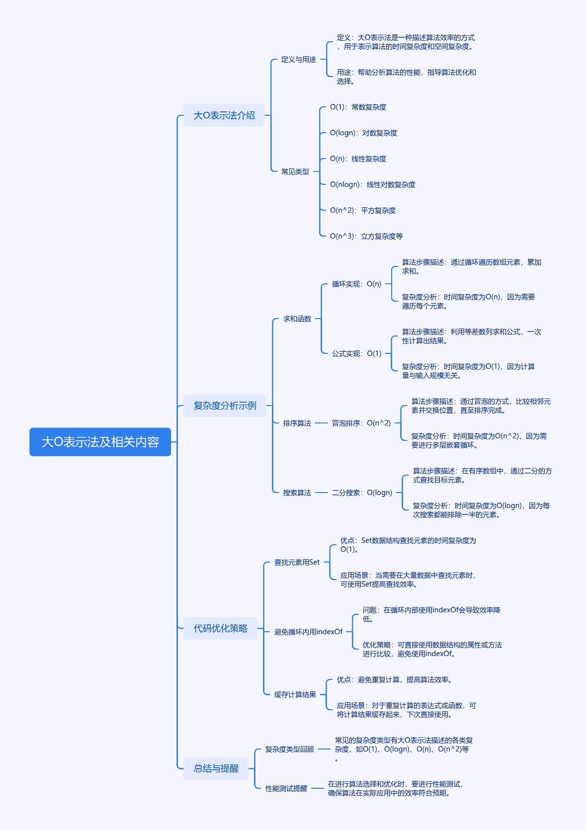 本文介绍大O表示法,用于描述函数输入与执行时间的关系。通过求和、冒泡排序、二分查找等算法示例,阐述O(1)、O(log n)、O(n)、O(n^2)复杂度。还给出优化代码时间复杂度的方法,如用Set查找、避免循环内用indexOf、缓存计算结果等。最后提醒性能优化要测试代码,总结大O复杂度类型及优化思路。