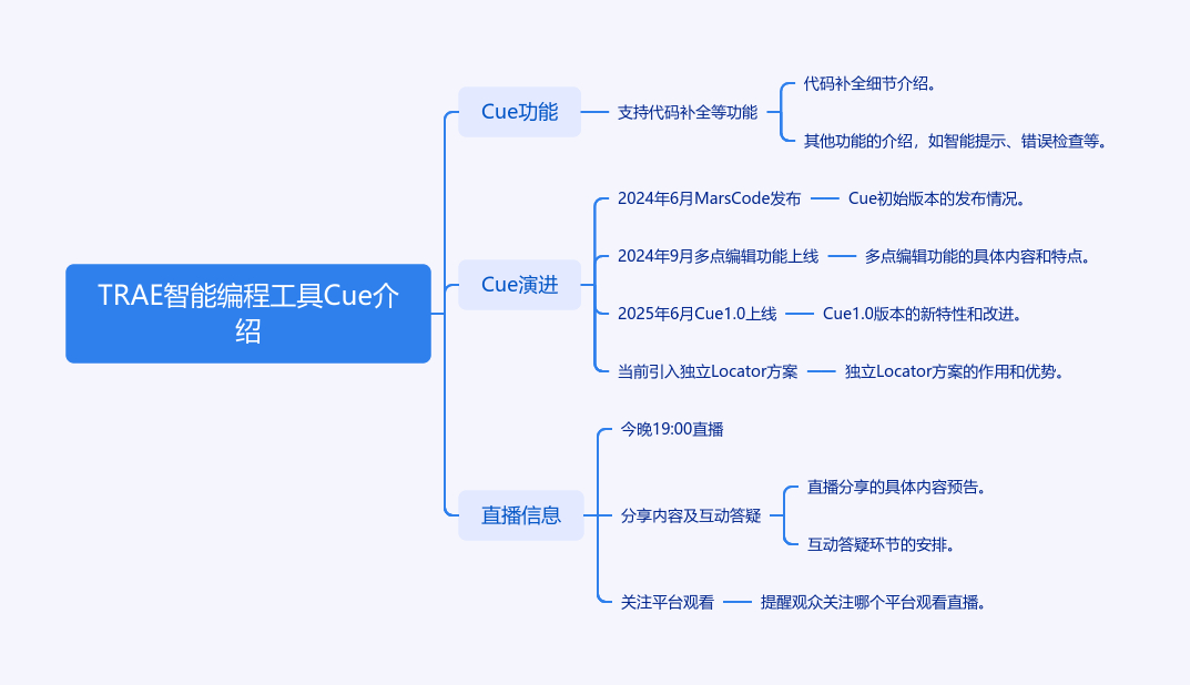 文章介绍了TRAE智能编程工具Cue,它支持代码补全、多行修改等功能。其演进从代码补全拓展到“下一步操作预测”,历经多个阶段,如2024年6月MarsCode国内发布支持代码补全,2025年6月Cue 1.0上线等。今晚19:00直播间将回顾其发展历程、了解功能升级、揭秘未来迭代,还有分享内容和互动答疑、赠周边,可关注TRAE官方多平台观看。
