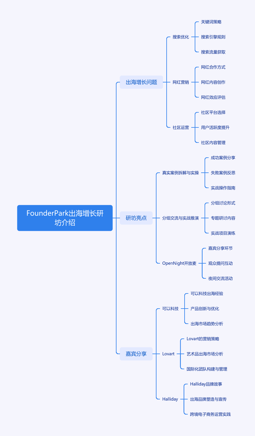 文章介绍 Founder Park 出海增长研坊。出海增长有搜索优化、网红营销、社区运营等共性问题,研坊邀请优秀一线操盘导师。内容上,拆真实案例,含大量实操环节,如推演目标市场、分析 SEO 问题等;形式为分组交流,鼓励实战推演;还设 Open Night 开放麦,邀请小有成就的产品嘉宾分享经验,旨在让学员收获实操经验、伙伴及未来合作可能。