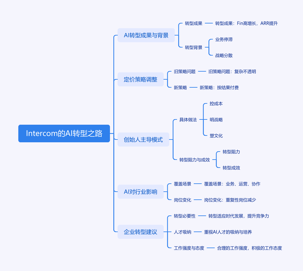 本文讲述 Intercom 从 SaaS 老牌公司向 AI-first 转型的故事。转型前公司业务停滞、决策失误、战略分散;创始人回归后裁员、聚焦客服、推出 Fin 产品,采用按结果付费定价模式。目前 Fin 增长率超 300%,ARR 显著增长。转型还需采用创始人主导模式,明确战略、重塑文化。同时提到 AI 将重塑各行业,企业在 AI 时代必须转型。