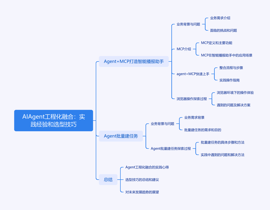 本文分享AI Agent与工程融合在两业务场景的实践。一是用Agent + MCP打造智能播报助手,介绍MCP协议、上手步骤、浏览器操作等,解决定时看报表痛点;二是Agent批量建任务,起初让Agent处理复杂逻辑效果差,后工程与Agent结合,发挥各自所长。总结指出应将Agent与工程结合,扬长避短,准确把握技术边界构建高效方案。