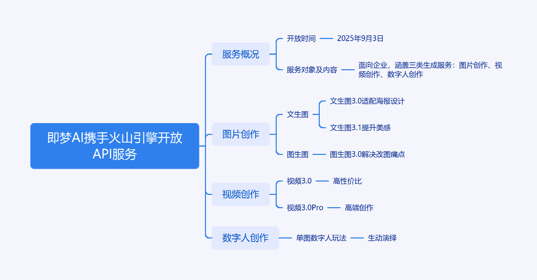 2025年9月3日,即梦AI携手火山引擎全面开放API服务,面向企业开放。服务涵盖图片、视频、数字人生成三类,有多款同源前沿模型。图片创作有文生图3.0、3.1和图生图3.0版本,贴合商用需求、提升美感、解决改图痛点;视频创作有高性价比的视频3.0和专注高端的3.0 Pro;数字人创作推出单图数字人玩法,能生动演绎。