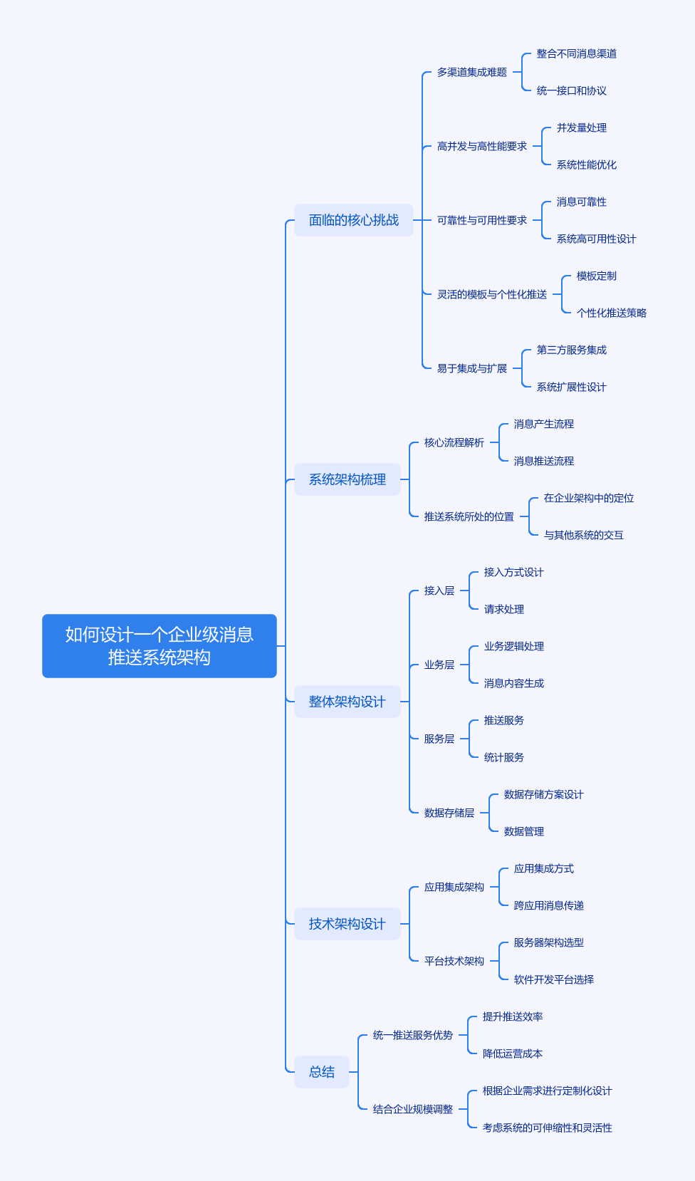 文章指出企业规模扩大时,各业务系统重复开发消息推送功能存在问题,需设计统一消息推送系统。先介绍面临的多渠道集成、高并发等核心挑战,接着梳理消息推送核心流程及系统位置,然后阐述整体架构的接入、业务、服务、数据存储四层功能,又说明技术架构的应用集成和平台技术架构,最后总结统一推送服务优势,还提醒落地要结合企业规模调整。
