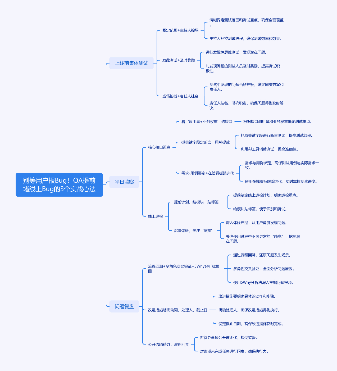 文章介绍QA提前堵线上Bug的3个实战心法。上线前集体测试,用明确目标和规则避免‘全员划水’,让群体智慧爆发。平日监察采用接口巡查和人工巡检,接口巡查精准选接口、高效定断言、跟紧迭代;人工巡检提前计划、跳出技术惯性。问题复盘建立闭环机制,深挖根因、落实措施、跟进待办,把常规方法做透,提前发现问题。