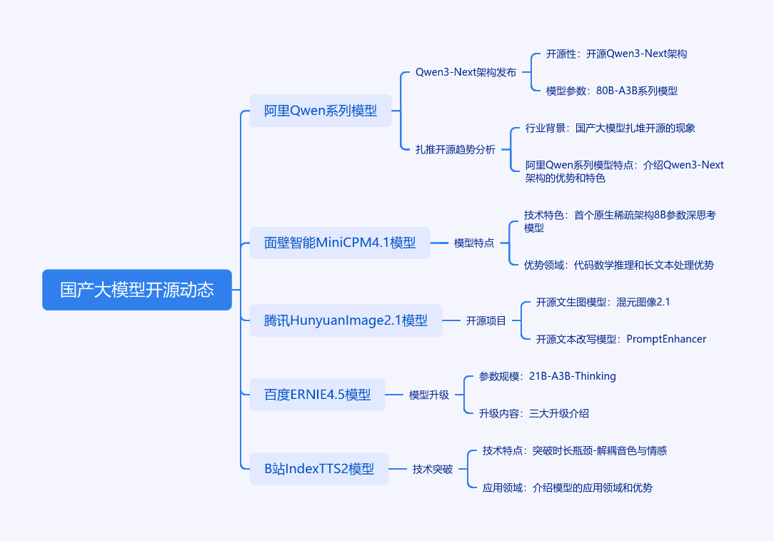 国产大模型持续开源,涉及阿里、面壁智能、腾讯、百度、B站等。阿里发布Qwen3 - Next架构,开源系列模型,推理吞吐提升、成本降低;面壁智能发布MiniCPM 4.1,代码数学推理快,长文本缓存需求低;腾讯开源文生图模型“混元图像2.1”及文本改写模型;百度ERNIE - 4.5 - 21B - A3B - Thinking有三大升级;B站IndexTTS2突破时长瓶颈,解耦音色与情感。