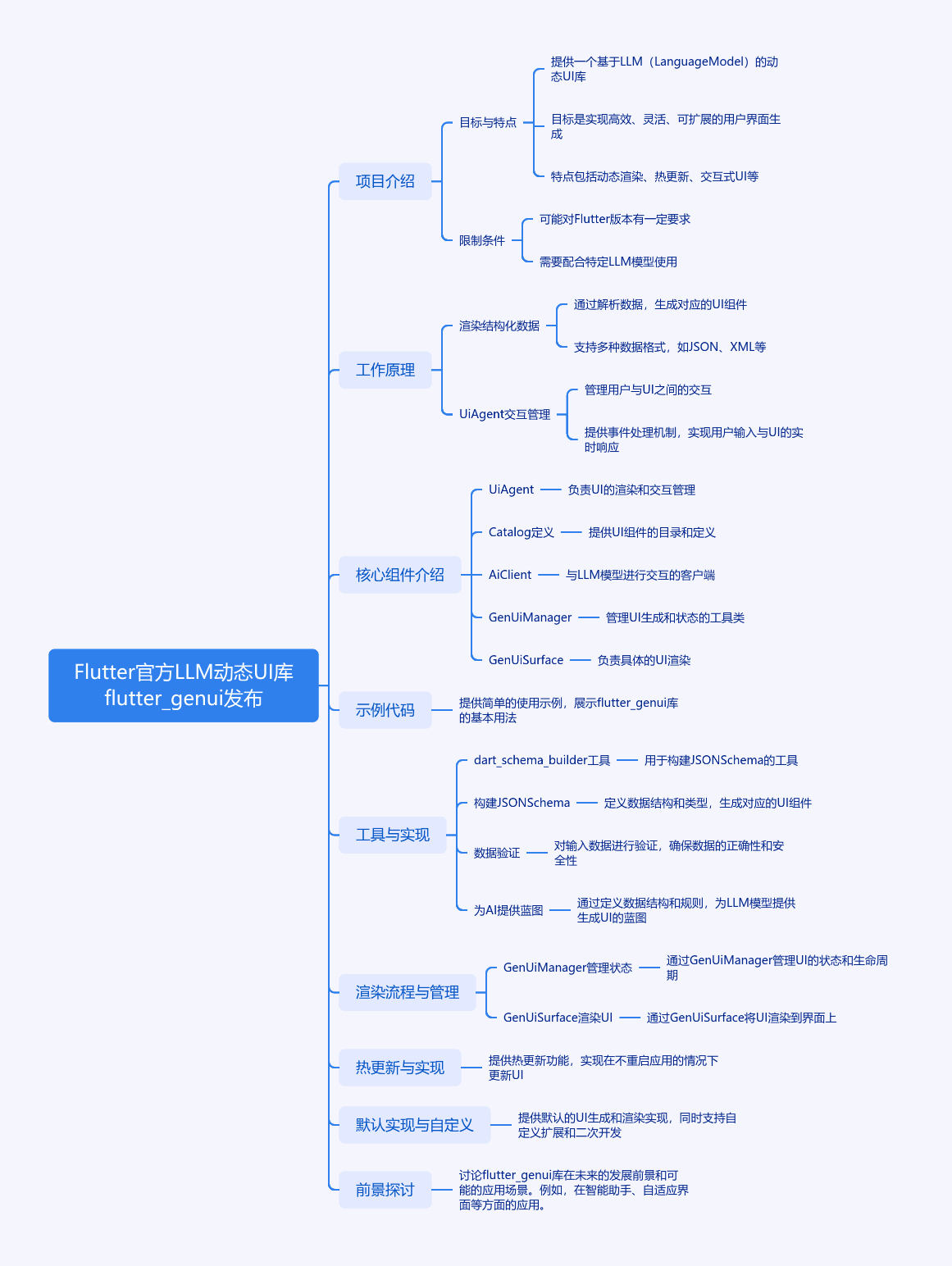 Flutter 官方发布 AI 大模型 package 项目 genui,它能基于 AI 模型,根据与用户实时对话动态生成 UI。其通过 UiAgent 管理与 AI 交互,开发者可定义 Widget 词汇表 Catalog 供 AI 构建 UI。核心对象包括 UiAgent、Catalog、AiClient 等。底层用 dart_schema_builder 创建和验证 JSON Schema。genui 利用 AI 大模型动态渲染 UI,还可实现有限热更新,默认基于 Firebase,也支持自定义 client。