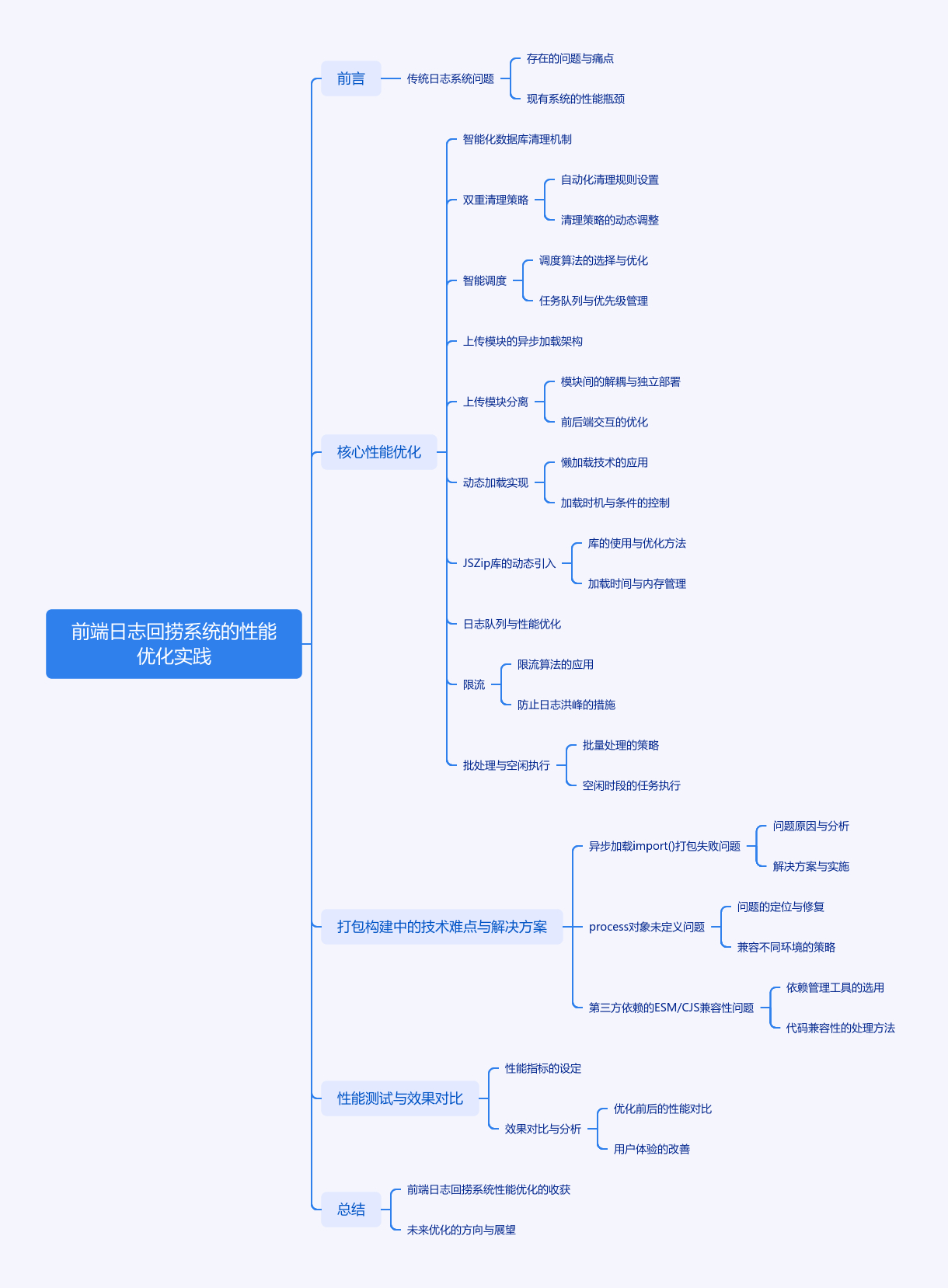 本文围绕前端日志回捞系统的性能优化展开。针对存储膨胀、包体积大、性能影响用户体验等问题,提出智能化数据库清理机制、上传模块异步加载架构、JSZip 库动态引入和日志队列优化等策略。同时解决了打包构建中的异步加载 import() 打包失败、process 对象未定义、第三方依赖 ESM/CJS 兼容性等难点,最终完成系统优化,积累工程化经验。