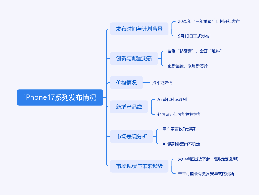 2025年是苹果“三年重塑”计划开年,9月10日发布更新全面的iPhone 17系列。此次告别“挤牙膏”式创新,全面“堆料”,更新多项配置,性能有看点,价格持平或降低。新增Air产品线替代Plus机型,但性能牺牲多,命运未知。苹果近年在大中华区出货量下滑,营收失血,需用该系列赢回中国用户,未来或有更多安卓式创新。