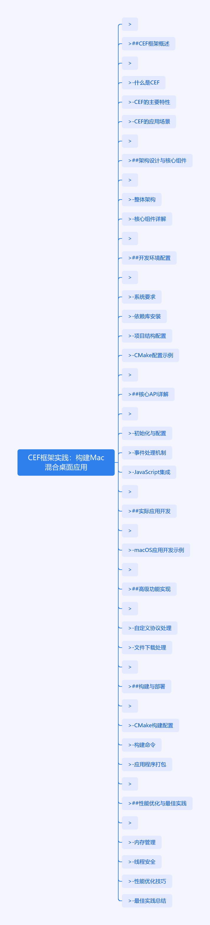 本文围绕CEF框架构建Mac混合桌面应用展开。先介绍CEF框架,包括概念、特性、应用场景。接着阐述架构设计与核心组件,如CefApp、CefClient等。说明开发环境配置、核心API使用、事件处理、JavaScript集成。给出实际应用开发示例,涉及高级功能实现。还介绍构建与部署方法,包含CMake配置、打包。最后提及性能优化、常见问题及解决方案,强调CEF适用于多场景,助开发者创建高性能应用。
