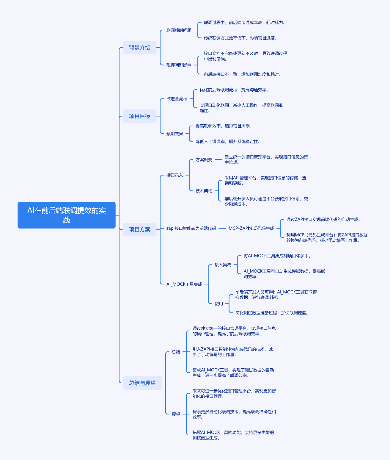 文章围绕AI在前后端联调提效展开。当前前后端联调存在接口文档维护不及时、手动编码低效等问题。项目目标是通过AI改进全流程,提升联调效率。方案包括接口录入,统一数据源生成OpenAPI;用MCP - ZAPI实现前端代码自动生成;集成AI_MOCK工具生成真实mock数据。实践证明AI在联调中成效显著,未来联调流程将因AI发展而变革。