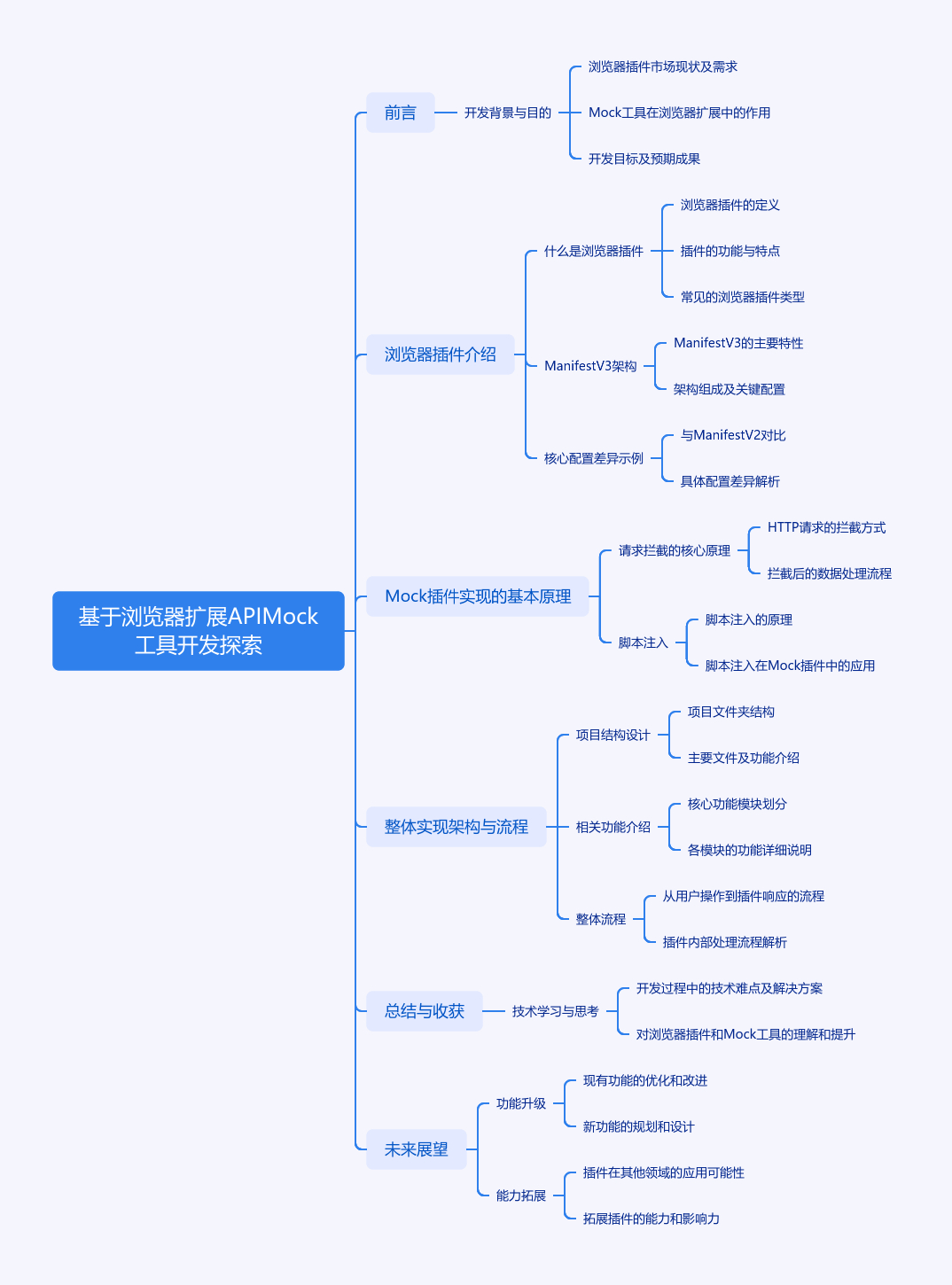 文章围绕基于浏览器扩展的 API Mock 工具展开。先介绍浏览器插件,提及 Manifest V3 架构及配置差异;阐述 Mock 插件原理,包括重写原生 API 拦截请求和多重注入脚本;说明项目结构、功能如创建规则、白名单管理和请求日志,以及整体流程;总结开发收获,思考 AI 辅助开发;展望未来,提出功能升级和结合 AI 能力拓展的方向。