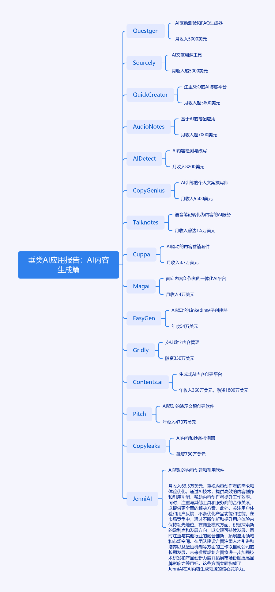 文章是垂类AI应用报告AI内容生成篇,介绍17家初创公司。涉及AI内容生成、检测等领域,如Questgen可生成测验和FAQ,Sourcely能溯源文献。各公司营收不同,像Questgen月收入5000美元,Jenni AI达63.3万美元;部分有融资,如Gridly融资330万美元,Read AI融资8100万美元。之后还会有其他领域垂直报告。