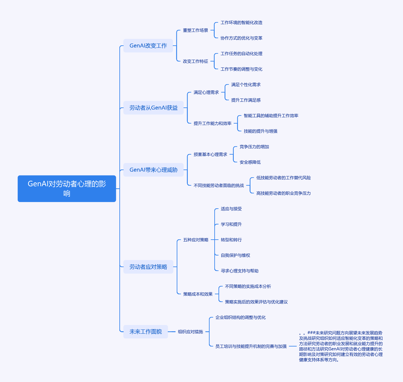 文章探讨GenAI对劳动者心理的影响。它重塑工作场景,增强或替代劳动者。一方面,GenAI能满足劳动者胜任感、自主性和归属感需求,提升生产力;另一方面,也会损害这些需求,带来心理威胁,如削弱胜任感、自主性和归属感。劳动者可采用直接解决、象征性自我完成等五种策略应对。组织应融入心理学知识,缓解威胁,未来还需研究GenAI对不同方面的影响等问题。