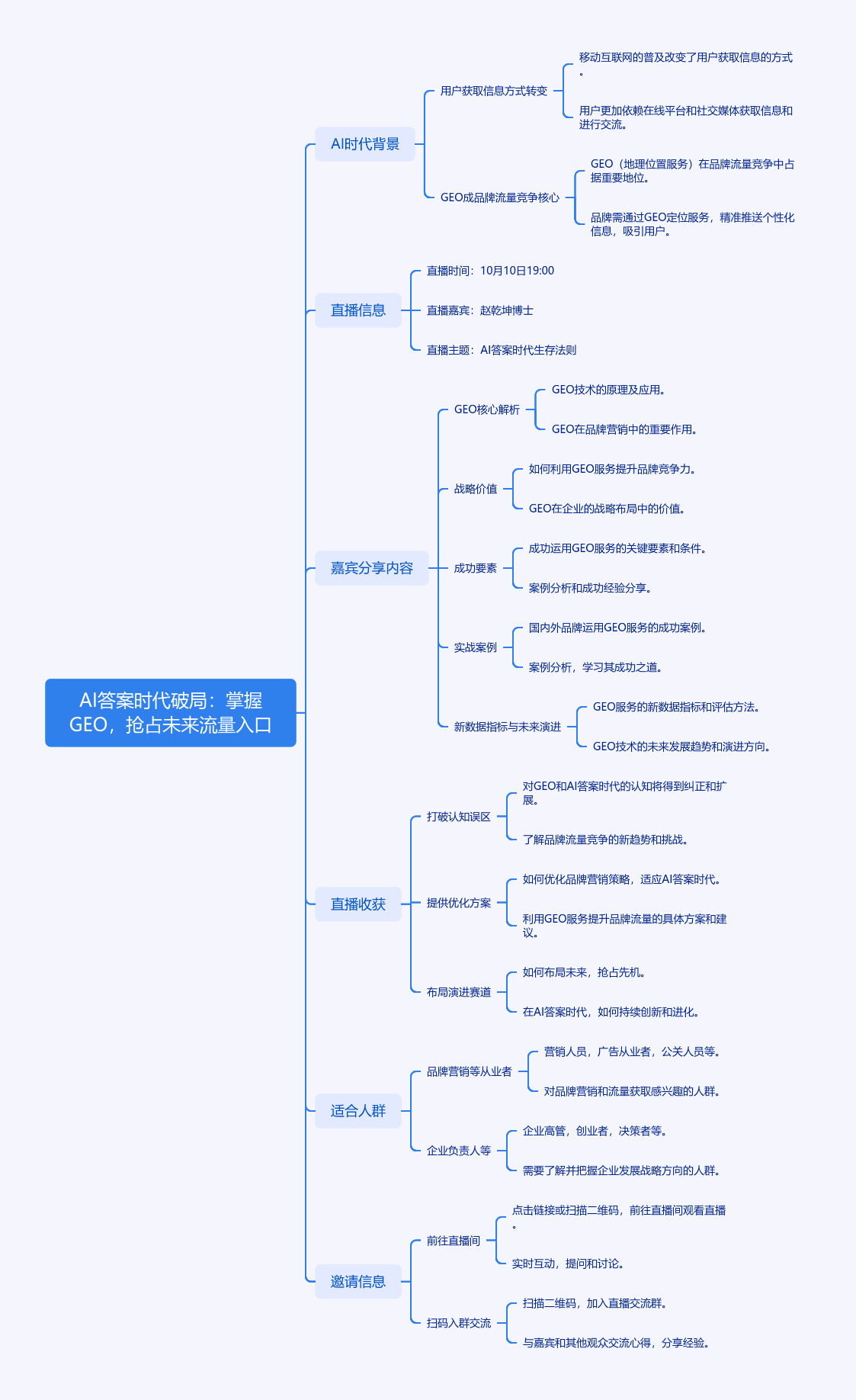 AI进入“答案时代”,用户获取信息方式转变,GEO成品牌流量竞争核心。10月10日19:00算泥社区直播间,赵乾坤博士聚焦“AI答案时代生存法则”,从底层逻辑到实操落地讲GEO优化,包括核心解析、战略价值、成功要素、实战案例等。直播能为不同人群提供GEO优化方案,助其抢占流量红利,还可扫码入群交流。