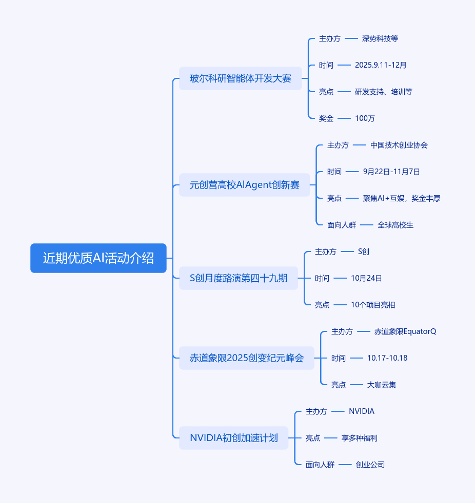 文章介绍近期优质AI活动。玻尔科研智能体开发大赛由深势等举办,分两阶段至12月,有研发支持、培训、孵化等亮点,奖金100万。元创营高校Al Agent创新赛面向全球高校生,9月22日 - 11月7日在上海举行,聚焦AI+互娱,奖金丰厚。S创月度路演第四十九期10月24日在上海举办,有10个项目亮相。赤道象限2025创变纪元峰会10.17 - 10.18在上海,大咖云集。NVIDIA初创加速计划面向创业公司招募,报名有福利。