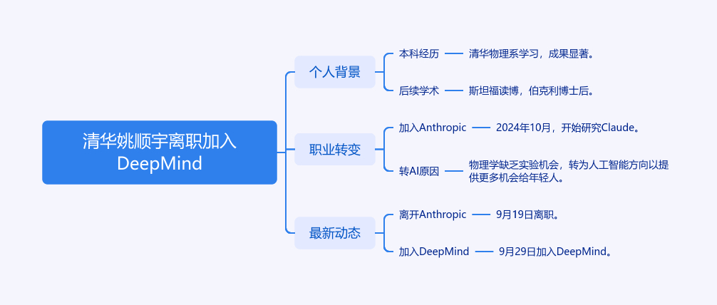 本文介绍了姚顺宇跳槽一事。他离开Anthropic加入谷歌DeepMind,在Anthropic工作一年,参与组建强化学习团队等。他从物理领域转向AI,因物理研究缺乏实验瓶颈,AI发展快且有吸引力。离开Anthropic一是因价值观分歧,对中国科研者不友好;二是内部细节未公开。他本科清华、博士斯坦福,学术成果突出。此外还提到同届同学姚顺雨也跳槽,两人先后入局大模型并开启新旅程。