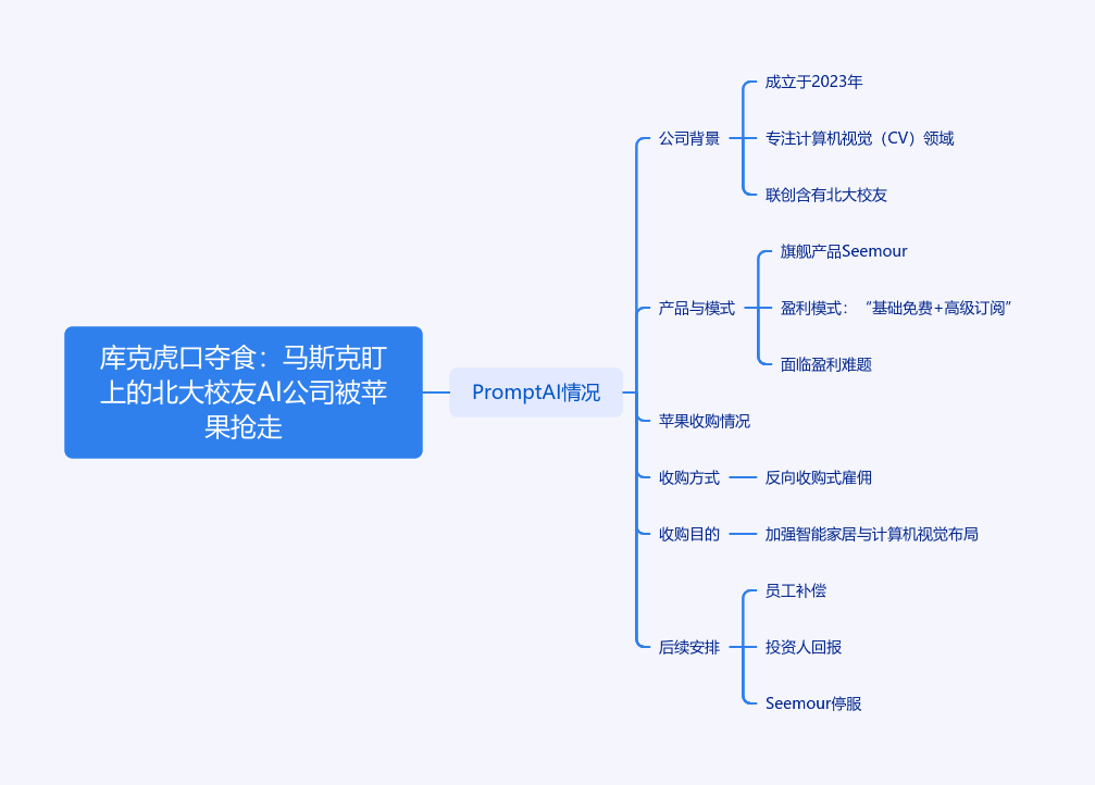 苹果从马斯克手中截胡AI初创公司Prompt AI,双方处于后期谈判阶段,苹果欲买走其核心团队和技术资产。该公司成立于2023年,专注CV,规模小,旗舰产品Seemour针对家庭摄像头+AI视觉识别赛道。公司采用“基础免费+高级订阅”模式,盈利困难。苹果此举或为加强智能家居与CV布局,交易若完成,Seemour将停服,员工和投资人有相应安排。