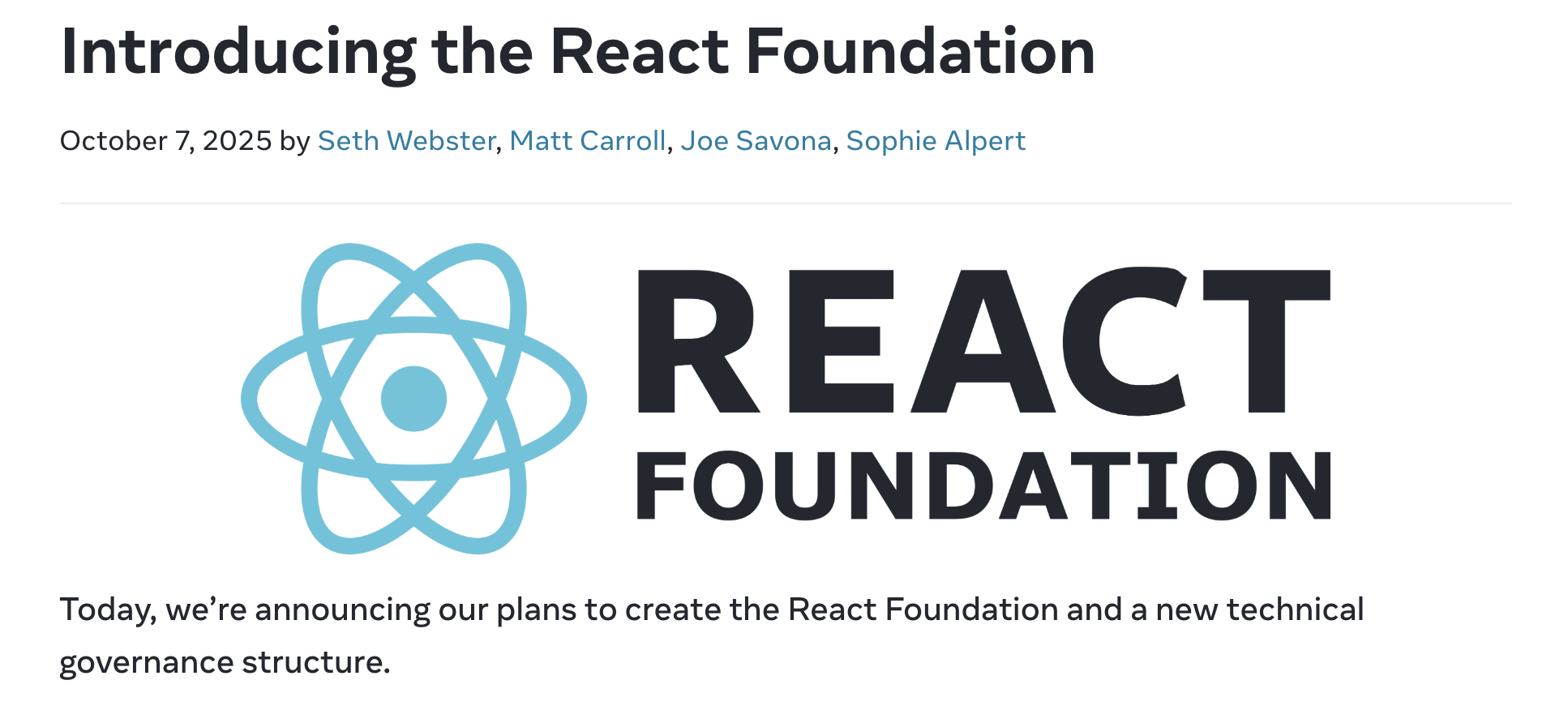 文章宣布创建 React 基金会及新的技术治理结构的计划。React 开源超十年,贡献者和贡献范围显著增长。为服务社区,将把 React 和 React Native 从 Meta 移至新基金会,还会实施独立技术治理结构。基金会将维护基础设施、组织会议、支持生态项目,由董事会管理。同时会定义独立于基金会的技术治理结构,未来分享详情。