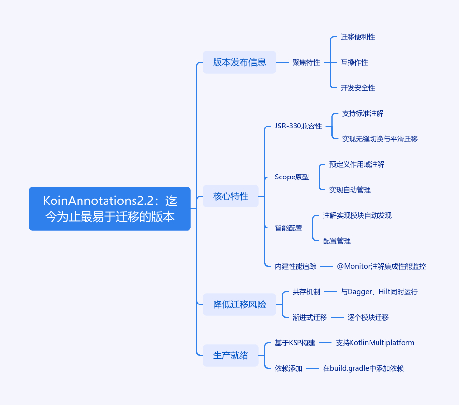 Koin Annotations 2.2 正式发布,聚焦迁移便利性、互操作性与开发安全性。核心特性有 JSR - 330 兼容性、Scope 原型、智能配置、内建性能追踪。支持标准注解,可与 Dagger、Hilt 无缝切换,提供共存机制降低迁移风险。有预定义作用域注解实现自动管理,通过注解实现模块自动发现与配置管理,还能集成性能监控。基于 KSP 构建,支持 Kotlin Multiplatform。