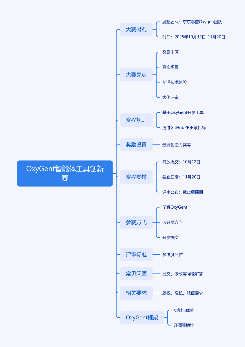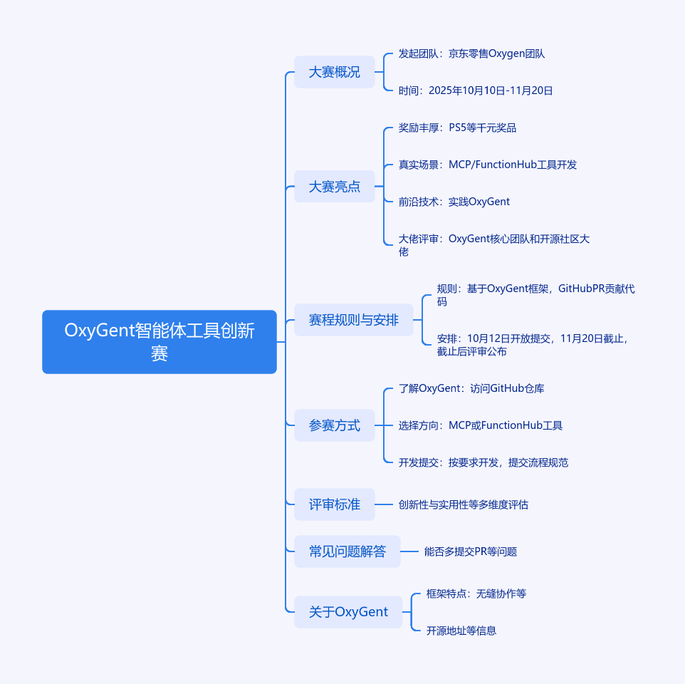 2025年10月10日至11月20日,京东零售Oxygen团队发起「OxyGent智能体工具创新赛」。大赛奖励丰厚,有PS5、索尼耳机等。聚焦MCP/FunctionHub工具开发,开发者可基于OxyGent框架用Python开发创新实用工具,通过GitHub PR贡献代码。赛程分开放提交、截止、评审公布阶段。介绍了参赛方式、评审标准,还解答常见问题,并介绍了OxyGent框架特点和开源地址等。