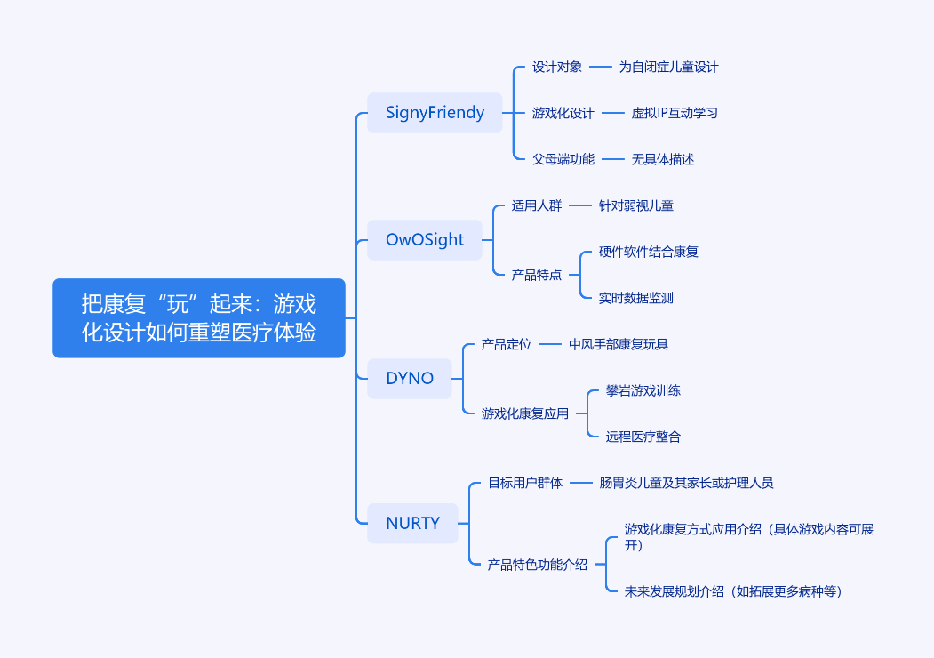 文章介绍了几款游戏化康复产品。“Signy Friendy”为自闭症儿童设计,通过AR和虚拟IP助其学习;“OwO Sight”针对3至6岁弱视儿童,用VR眼镜和康复游戏康复;“DYNO”为中风后手部障碍患者打造,将康复动作融入攀岩游戏;“NURTY”是服务5至7岁肠胃炎儿童的平台,用拟人化卡通人物促进康复。这些产品提升了康复趣味性与效果。