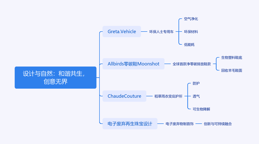 文章围绕“设计与自然:和谐共生,创意无界”主题,介绍了多款环保设计作品。Greta. Vehicle是环保人士专用车,有空气净化功能、用环保材料且低能耗;Allbirds零碳鞋Moonshot实现净零碳排放,鞋底用生物塑料,鞋面用回收羊毛;Chaude Couture项目将稻草雨衣变庇护所;电子废弃再生珠宝用电子废弃物制作,融合创新与可持续发展。