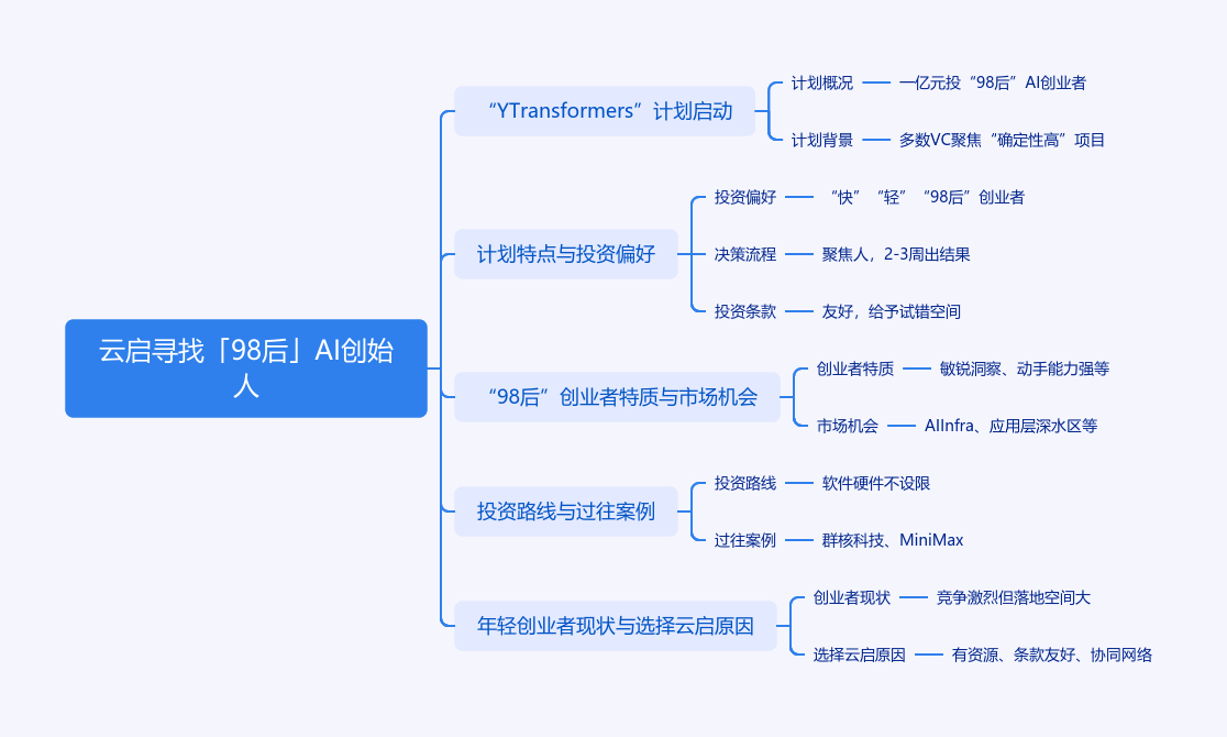 2025年中国AI创投圈热闹且分化,云启资本启动“Y Transformers”计划,拿出一亿元专项资金投“98后”AI创业者。该计划约投20 - 25个项目,6 - 12个月投完。云启认为年轻创业者无传统包袱、有AI - first思维,当下是其切入好时机。计划有快速决策、友好条款等优势,还提及投资偏好、不投特质及市场机会点等内容。