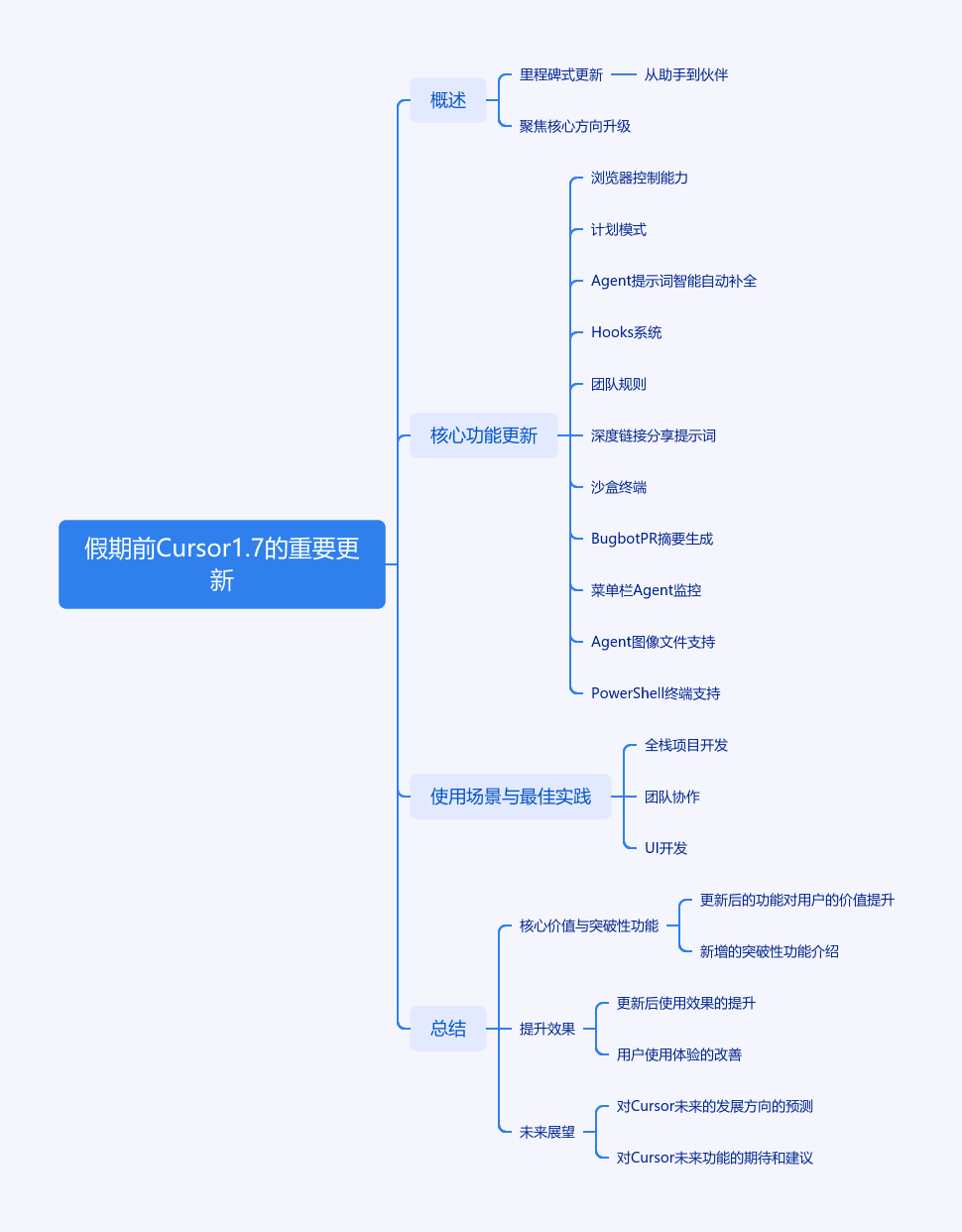 本文介绍 Cursor 1.7 重磅更新。此次更新是里程碑式跨越,将 AI 编程工具从‘代码补全助手’变为‘智能开发伙伴’。核心功能涉及浏览器控制、计划模式、Agent 提示词智能补全、Hooks 系统等。与其他 AI IDE 相比,Cursor 优势明显,能提升开发效率、减少沟通成本、提高任务成功率。未来,AI 编程工具将向更强大、精准、协作和安全的方向发展。