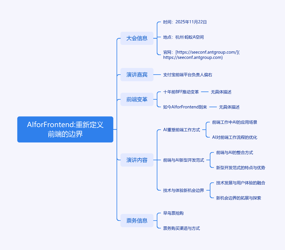 SEE Conf 2025 将于 2025 年 11 月 22 日在杭州·蚂蚁 A 空间举办。支付宝前端平台负责人偏右将出席大会作《AI for Frontend》演讲。十年前 BFF 推动前端工程化变革,如今 AI for Frontend 模式加速到来,AI 深度参与前端全流程。偏右将在大会分享 AI 重塑前端工作方式、新型开发范式及新机会边界。大会早鸟票正在抢购。