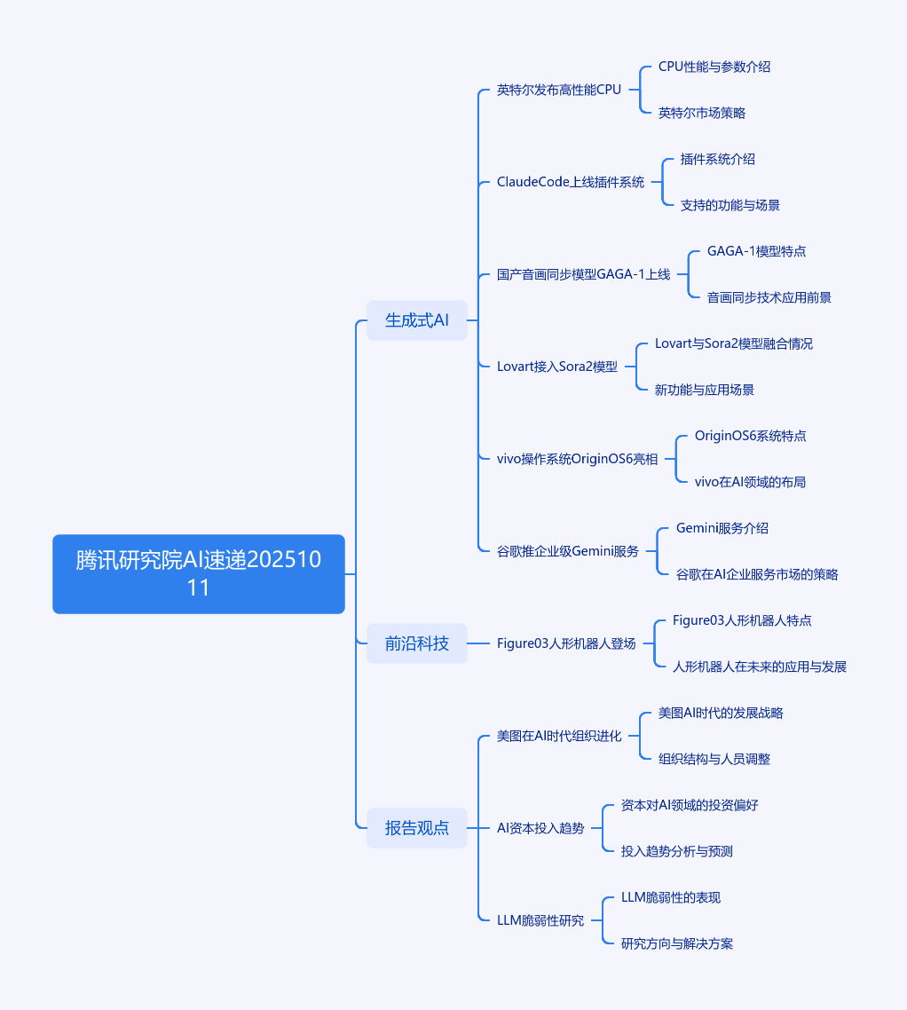 这是腾讯研究院2025年10月11日的AI速递,涵盖多领域进展。生成式AI方面,英特尔发布高性能CPU,Claude Code上线插件系统等;前沿科技领域,Figure 03人形机器人登场;报告观点部分,涉及美图组织进化、AI资本投入趋势、模型脆弱性等研究,展现了AI在硬件、软件、机器人及商业组织等多方面的发展与思考。
