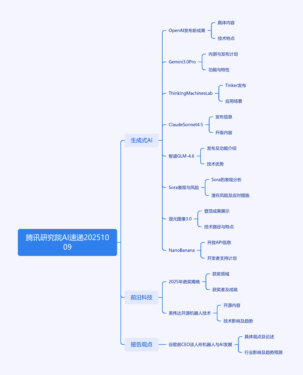 文章为腾讯研究院AI速递,涵盖生成式AI、前沿科技、报告观点。生成式AI方面,OpenAI、谷歌等发布新工具、模型;Sora、混元图像3.0等产品表现出色。前沿科技领域,公布2025年诺贝尔物理学和医学奖得主,英伟达开源机器人技术。报告观点提及谷歌前CEO认为中国或主导人形机器人市场,美国AI面临电力瓶颈,创业需围绕‘学习’构建系统。