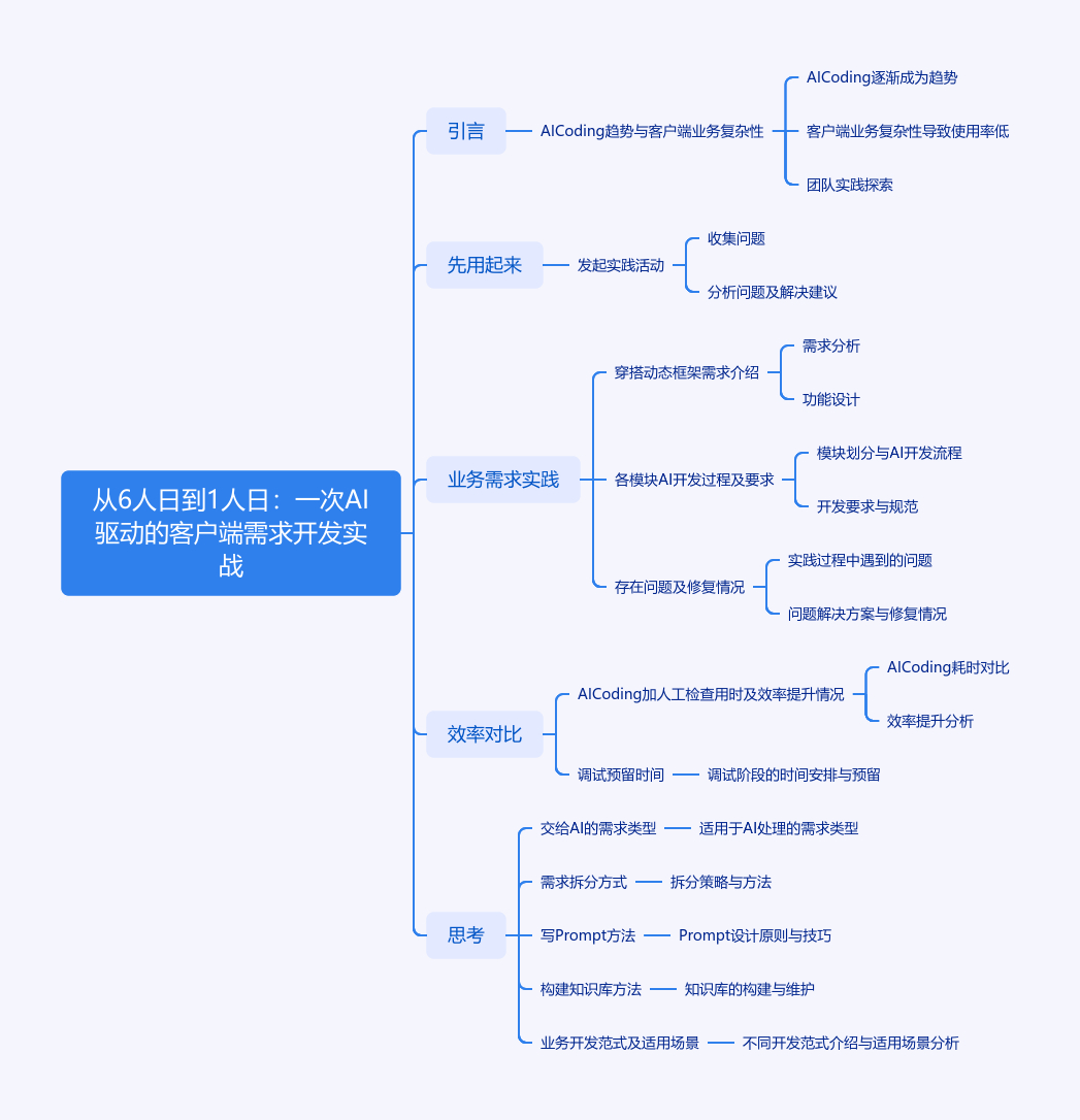 本文介绍AI驱动的客户端需求开发实战,先开展AI Coding实践活动并汇总问题。以穿搭动态框架需求为例,人做架构设计,AI完成各模块开发,如多信息流服务、UI容器、数据绑定协议等。AI Coding加人工检查用时1人日,原计划6人日,效率提升300%。还探讨让AI处理需求的阶段、需求拆分、写Prompt、构建知识库等问题,此开发方式适用于新功能开发。