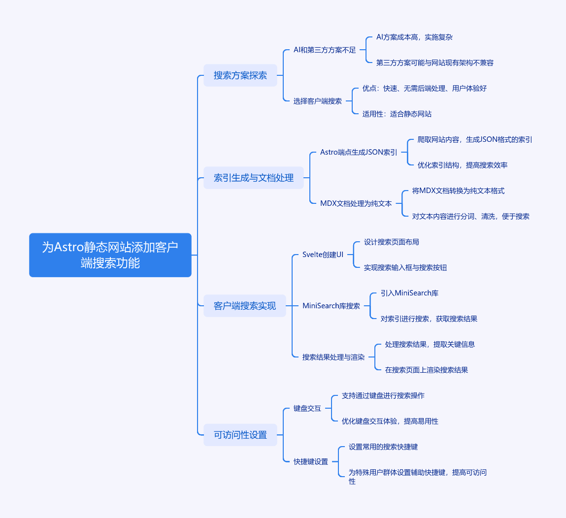 文章介绍为Astro静态网站添加客户端搜索功能的方法。作者起初考虑AI和第三方搜索方案,但因性能、定制性等问题放弃。后决定用预生成索引文件的客户端搜索,借助Astro端点生成JSON索引,处理MDX文档为纯文本。客户端用Svelte创建UI,结合MiniSearch库实现搜索,还对搜索结果解析处理。此外,强调搜索功能的可访问性,给出键盘交互和快捷键设置方法。