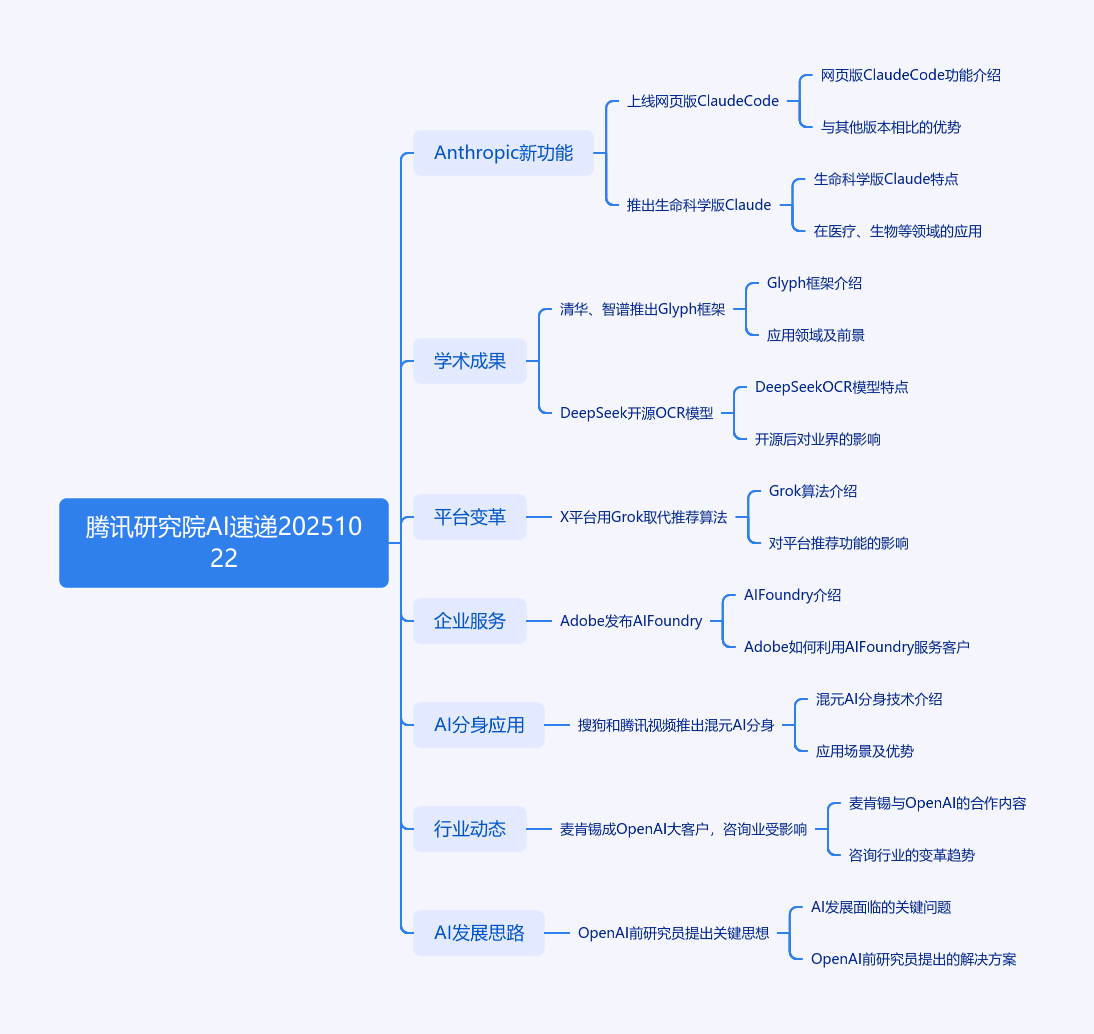 这是腾讯研究院2025年10月22日的AI速递,涵盖多项前沿进展。包括Anthropic上线网页版Claude Code及生命科学版;清华、智谱推出Glyph框架;马斯克宣布X平台将用Grok取代推荐算法;Adobe推AI Foundry助企业建模型;搜狗输入法和腾讯视频推出混元AI分身;麦肯锡成OpenAI Tokens消耗大客户;DeepSeek开源OCR模型;OpenAI前研究员提出2025年AI进展关键思路。