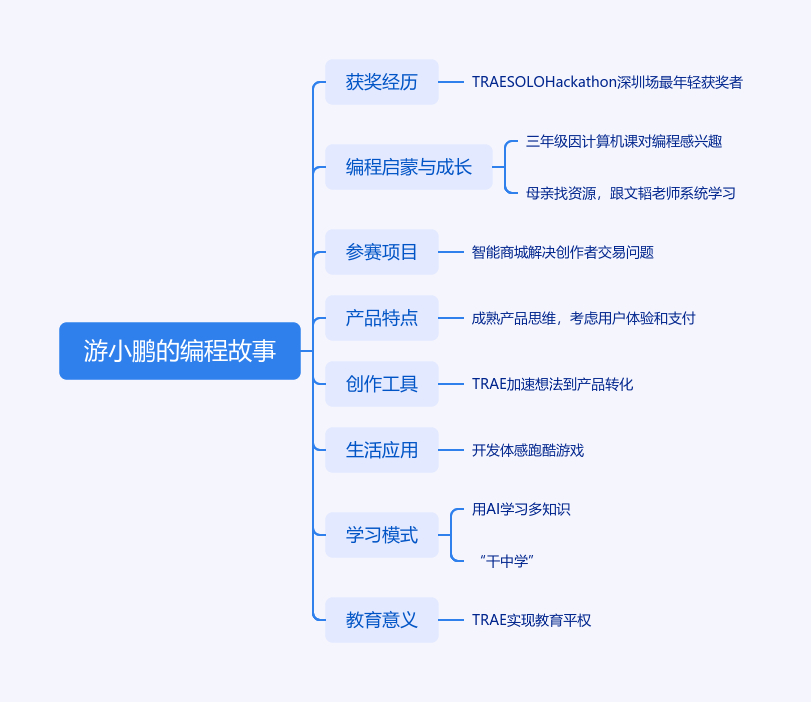 本文讲述12岁湖南岳阳平江少年游小鹏成为TRAE SOLO Hackathon深圳场最年轻获奖者的故事。他三年级对编程产生兴趣,母亲为其找资源,今年3月跟文韬老师系统学AI编程成“技术总监”。8月他带“智能商城”项目参赛,该平台为创作者解决交易难题。他的项目产品思维成熟,考虑用户体验和支付问题。他借助TRAE,从想法到产品加速,还开发体感跑酷游戏。他用AI学习多知识,其学习方式是“干中学”。TRAE降低编程门槛,实现教育平权,游小鹏未来想成程序员或老板。