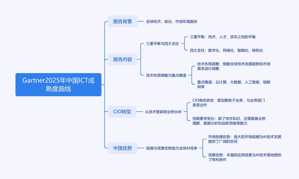 在全球经济增长放缓、地缘政治波动、市场需求多变背景下,Gartner发布2025年《中国通信与信息技术成熟度曲线》。今年报告提出‘三重平衡’与‘四大支柱’,构建CIO决策框架,实现技术投入、业务价值和组织稳健的动态均衡。报告中多项技术成熟度曲线位置变化,重点关注低代码应用平台等技术,移除数据中台等技术,优先关注行业云平台等。CIO正从技术管家转向业务伙伴,反映中国企业对数字化投资的理性态度。中国在全球AI竞争中有规模与场景优势,此曲线为CIO提供认知框架,标志中国企业数字化转型进入‘价值落地’阶段。