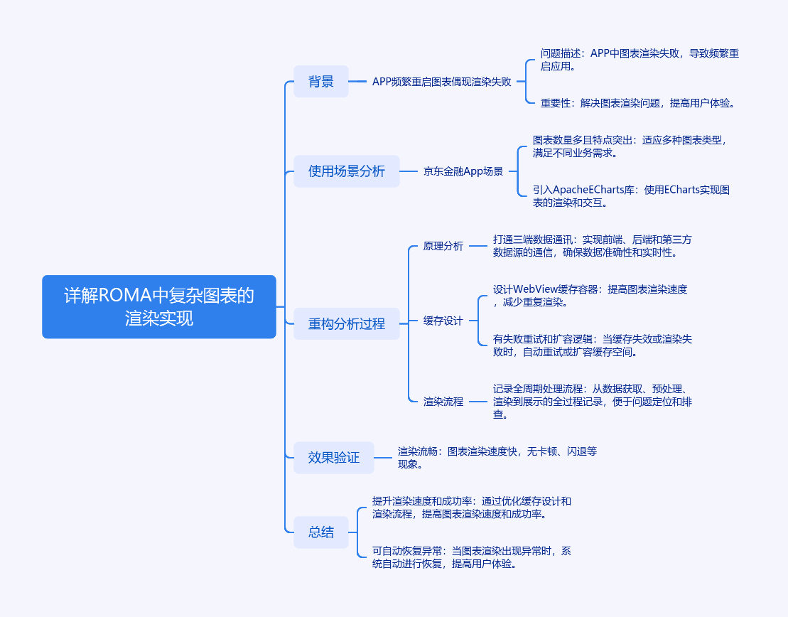 文章围绕ROMA中复杂图表渲染实现展开。ROMA负责京东金融APP关键位置复杂图表渲染,近期APP频繁重启时首页图表偶现渲染失败。经分析,京东金融App图表使用场景多、特点突出,引入Apache ECharts库。重构分析包括原理、缓存设计和渲染流程,原理上打通三端数据通讯;缓存设计用可重复利用且自动扩容的WebView缓存容器,加入失败重试逻辑;渲染流程涵盖多场景处理。效果验证显示渲染流畅,重构后提升了渲染速度和成功率,还能自动恢复异常数据渲染。