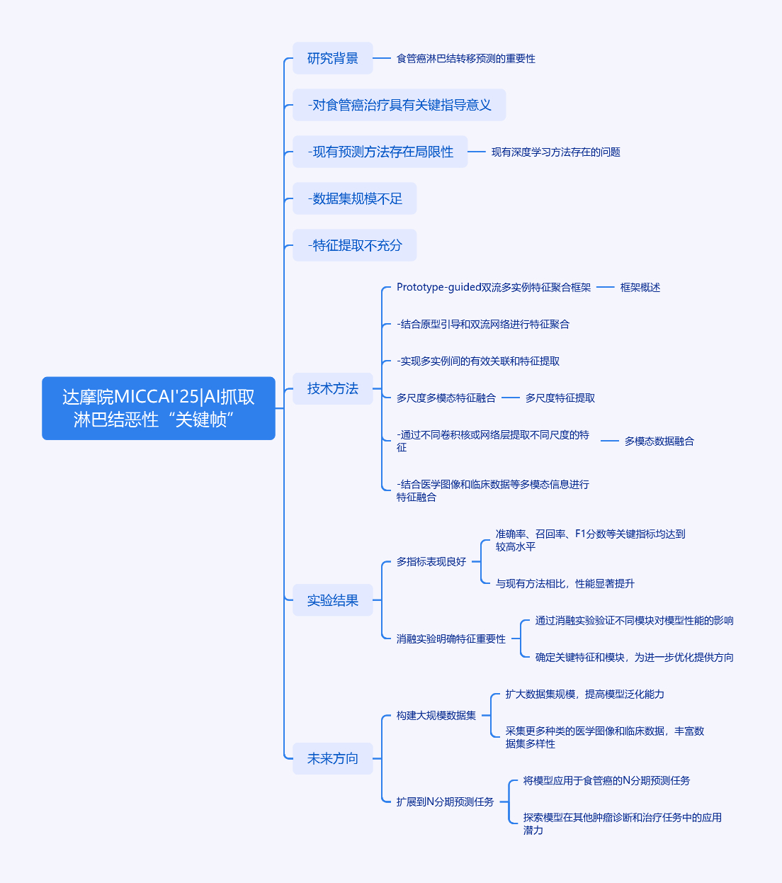 文章围绕基于CT图像的食管癌淋巴结转移预测展开。指出深度学习方法虽提升了淋巴结鉴别性能,但存在问题,如更关注CT切片平均特征,缺乏关键特征提取融合,且未显式提取临床相关特征。为此,将3D淋巴结转移预测化为多实例学习问题,提出Prototype指导的双流MIL框架,有效捕捉局部和全局特征,还引入多尺度多模态融合模块,融合临床与深度学习特征。实验显示,该方法在多个指标表现良好,消融实验验证了形态特征重要性及合适的slice数量。未来可构建大规模数据集,扩展到N分期预测任务。