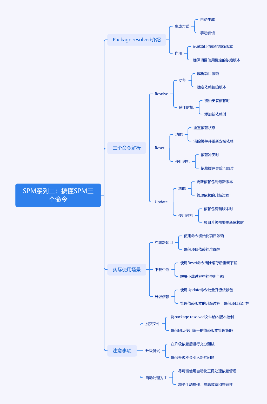文章围绕SPM的Resolve、Reset和Update三个常用命令展开。先介绍了Package.resolved文件,它记录实际下载版本和commit,确保团队用相同版本。Resolve用于重新解析依赖,不改该文件,适用于刚克隆项目无此文件或删除它的情况;Reset用于清除缓存和构建目录,在下载中断、包损坏等时使用;Update将依赖更新到最新版,会改变该文件,在修改版本要求或想更新时用。还给出了实际使用场景,如克隆新项目、下载中断、升级依赖等情况的操作。最后强调要提交Package.resolved到Git,升级依赖需测试,一般Xcode会自动处理,有问题再手动操作。