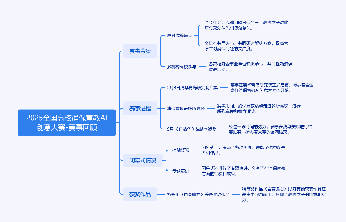 2025全国高校消保宣教AI创意大赛由蚂蚁集团等牵头,多所高校参与。5月9日在清华青岛艺术与科学创新研究院启幕,以“AI赋能消保,创意引领未来”为主题。赛事消保宣教走进多所高校,课程触达15所高校700多名学生。9月16日在清华大学美术学院结赛颁奖,超176个高校团队报名,23件作品入围展示。闭幕式有专题演讲。大赛还公布了包括特等奖《百变骗君》在内的多个奖项作品。主办方未来将推动获奖作品传播,助力构建安全金融环境。