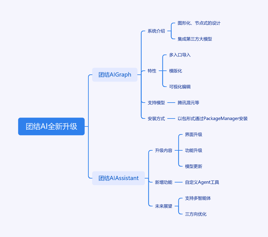 2025年10月23日团结AI全新升级。推出团结AI Graph,是图形化、节点式AI工作流系统,与第三方大模型合作,集成其能力。有引擎内多入口导入、模版化工作流、节点可视化编辑等特性,支持腾讯混元等大模型。团结AI Graph以包形式发布,通过Package Manager安装。同时,原Muse Chat AI模块升级为团结AI Assistant,优化界面、新增功能、更新后端模型,支持自定义Agent工具。未来团结AI Assistant将支持多智能体,围绕深度融合引擎生态、智能化任务理解与规划、开放与生态建设三个方向优化。