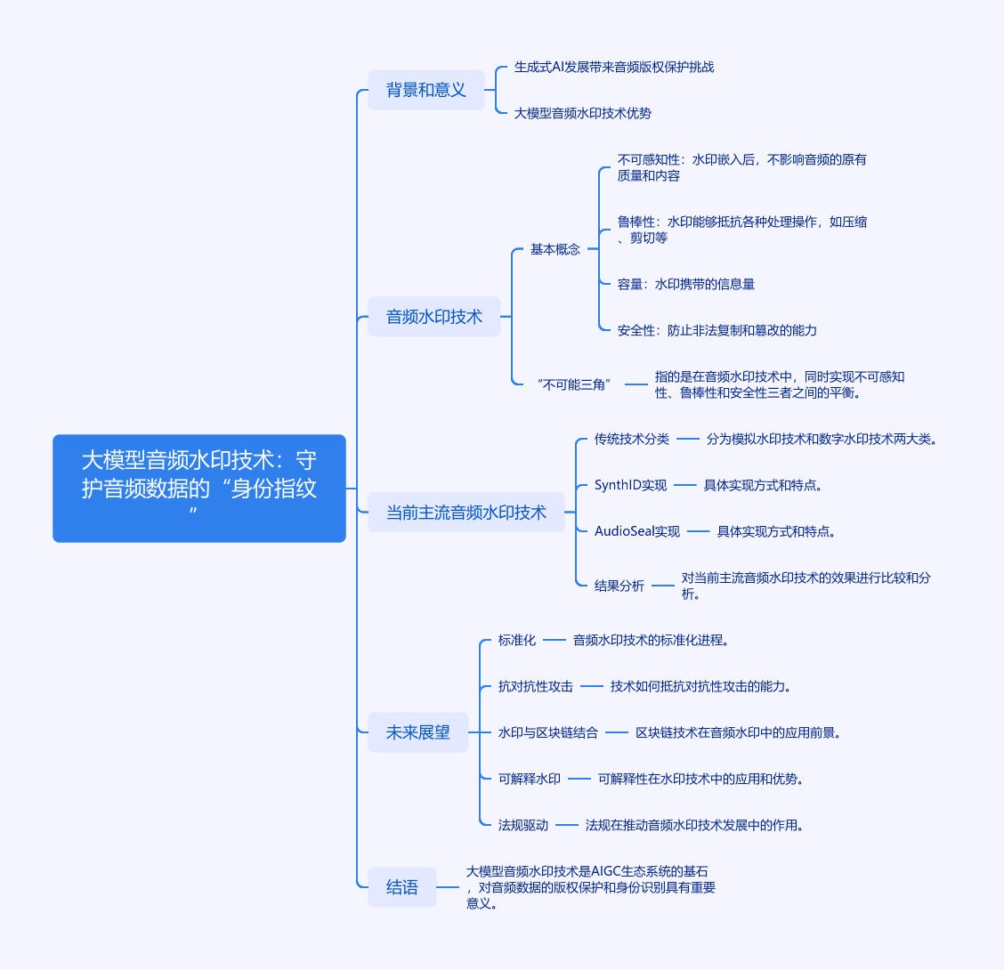随着生成式人工智能发展,合成音频广泛传播,给音频版权保护等带来挑战。传统音频水印技术有局限,大模型音频水印技术将水印嵌入过程集成到模型生成内部,提升了不可感知性和鲁棒性。文章介绍了音频水印技术的基本概念、核心指标及“不可能三角”,还介绍了传统音频水印技术。重点阐述了SynthID和AudioSeal两种AI水印技术的实现过程,AudioSeal在测试中实现高准确度嵌入与溯源检测。未来音频水印技术有标准化、抗对抗性攻击等趋势,它是构建AIGC生态系统的基石。
