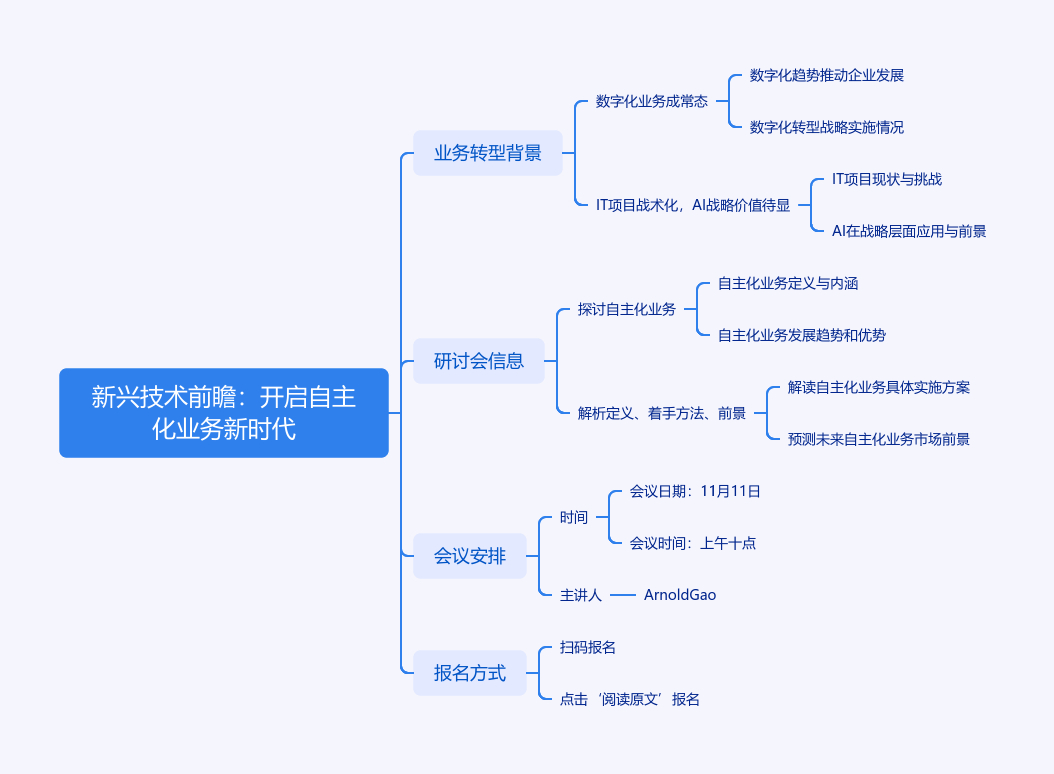 首席信息官及高管推动企业数字化转型多年,数字化业务成常态,需新方向。很多IT项目战术化,跟风部署人工智能生产力有提升但战略价值未显。Gartner将举办免费研讨会探讨自主化业务,分析其模式与挑战,助首席信息官和业务领导者把握机遇推动企业成长。会议将解析自主化业务定义、着手方法及未来前景,时间为11月11日上午十点,主讲人是研究副总裁Arnold Gao,提供二维码和点击‘阅读原文’两种报名方式。